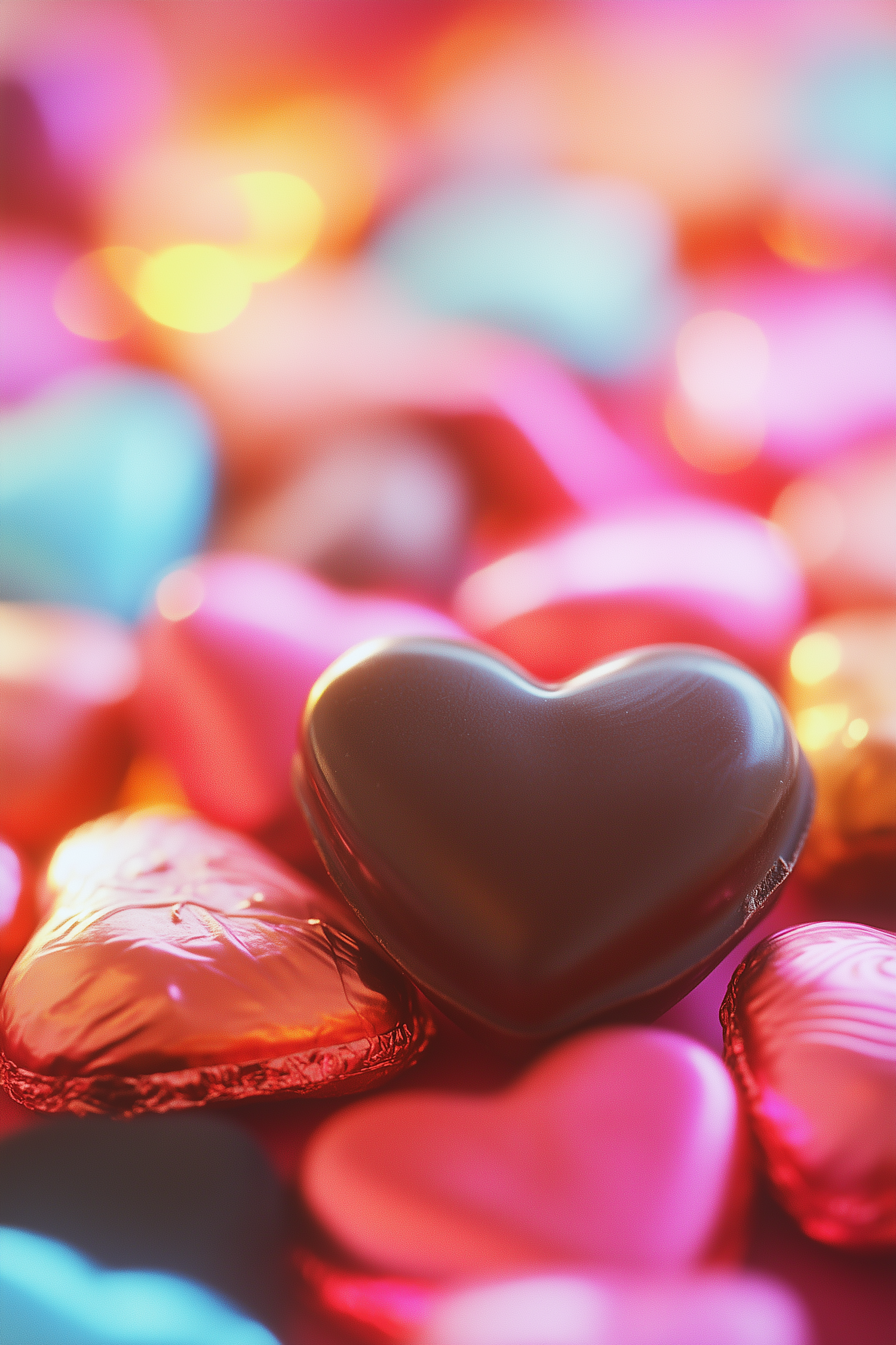 Heart-shaped chocolates in vibrant foil with warm bokeh lights create a festive and romantic atmosphere.
