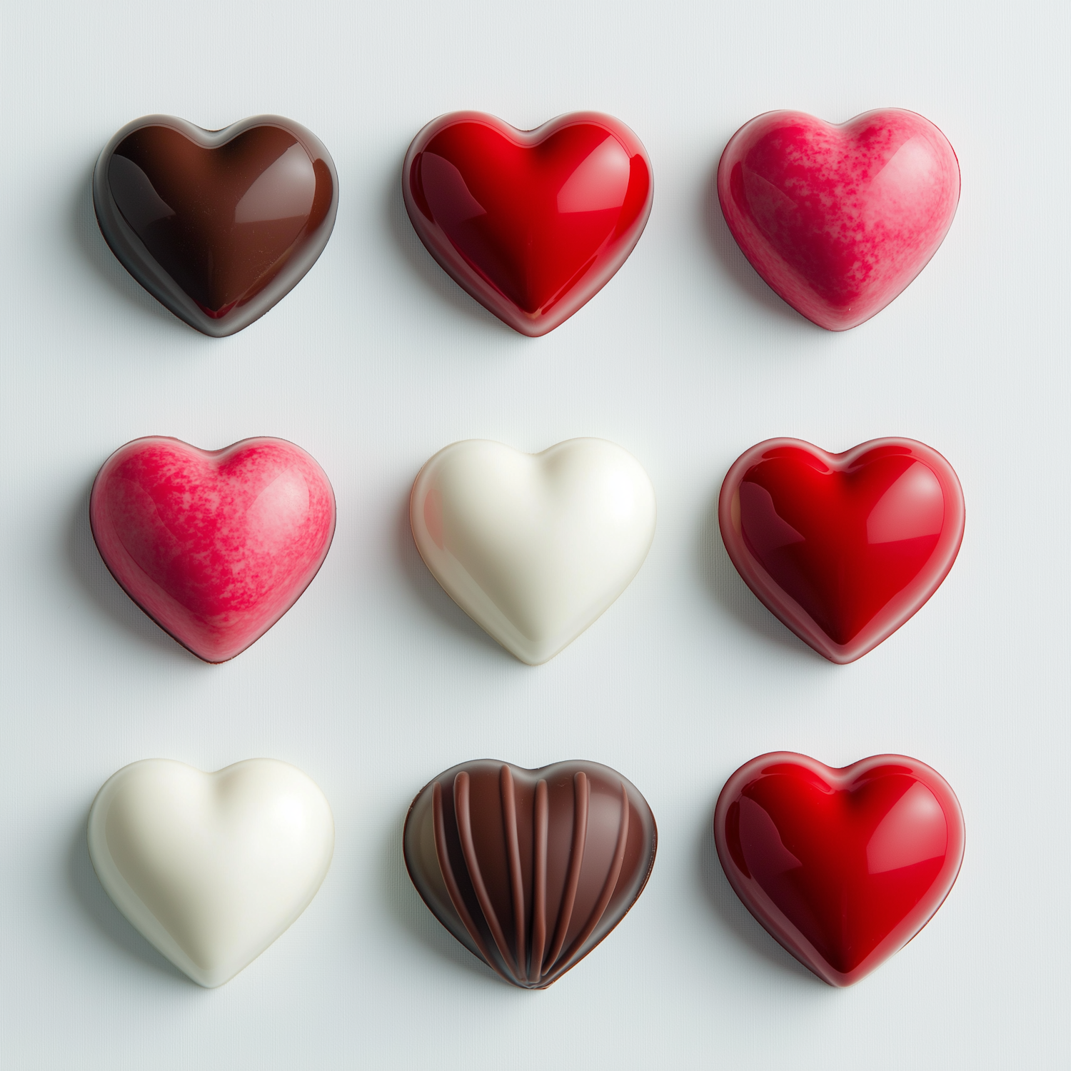 A grid of colorful heart-shaped chocolates in red, white, pink, and brown, each with unique textures and designs, on a light background.