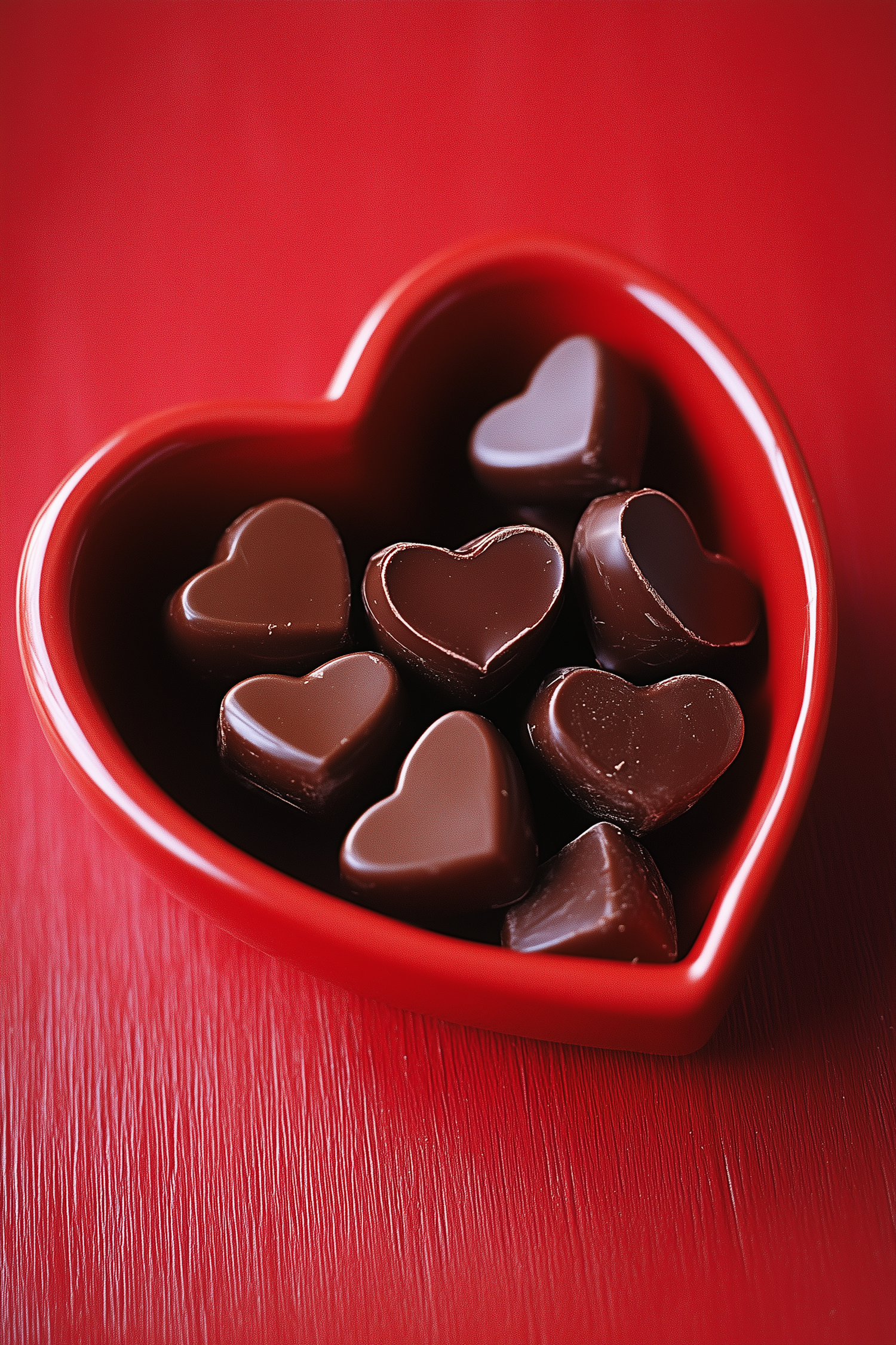 Heart-shaped chocolates in a red bowl on a red background, perfect for Valentine's Day.