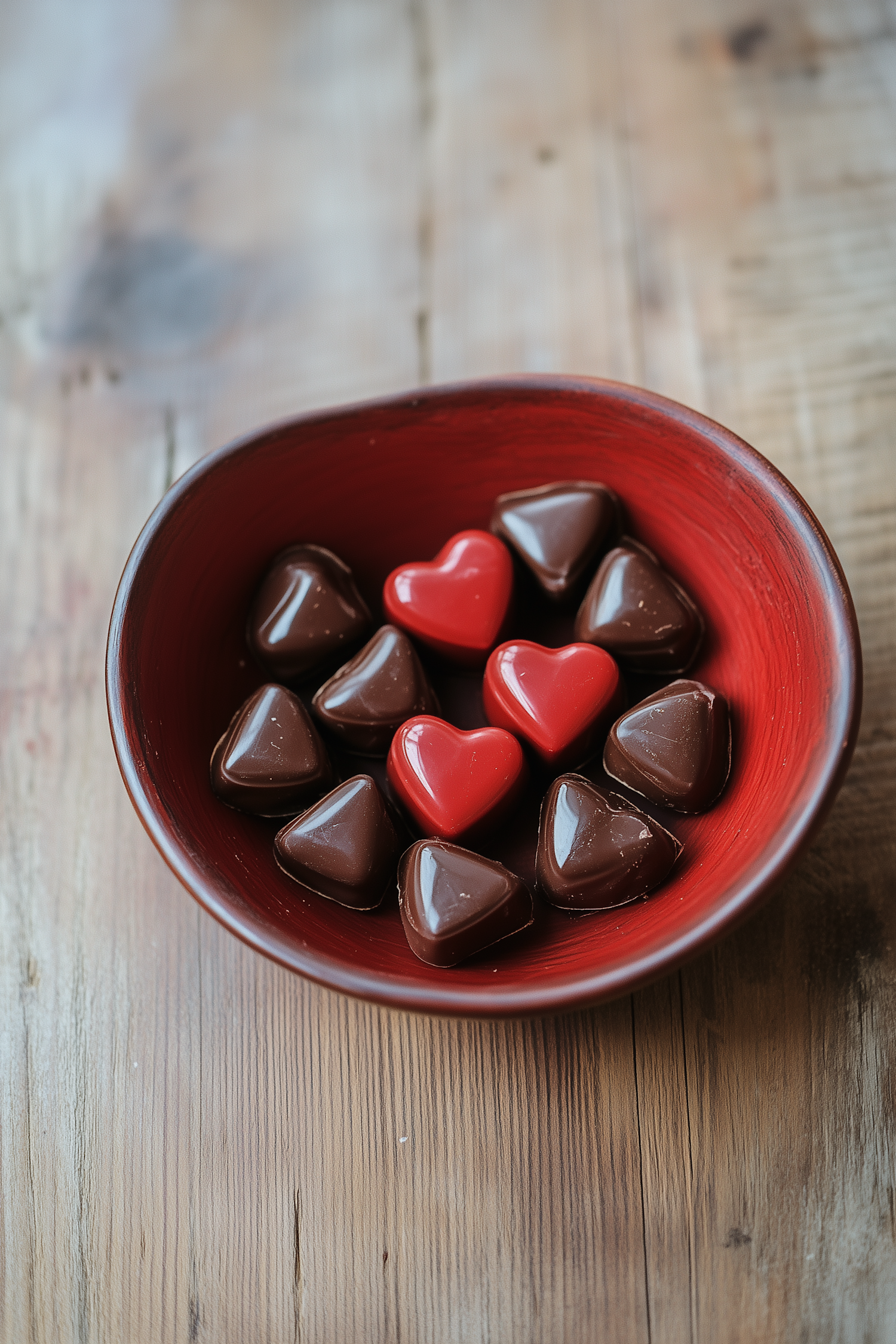 Heart-shaped chocolates in a red bowl on a rustic wooden table, featuring glossy red and dark brown treats.