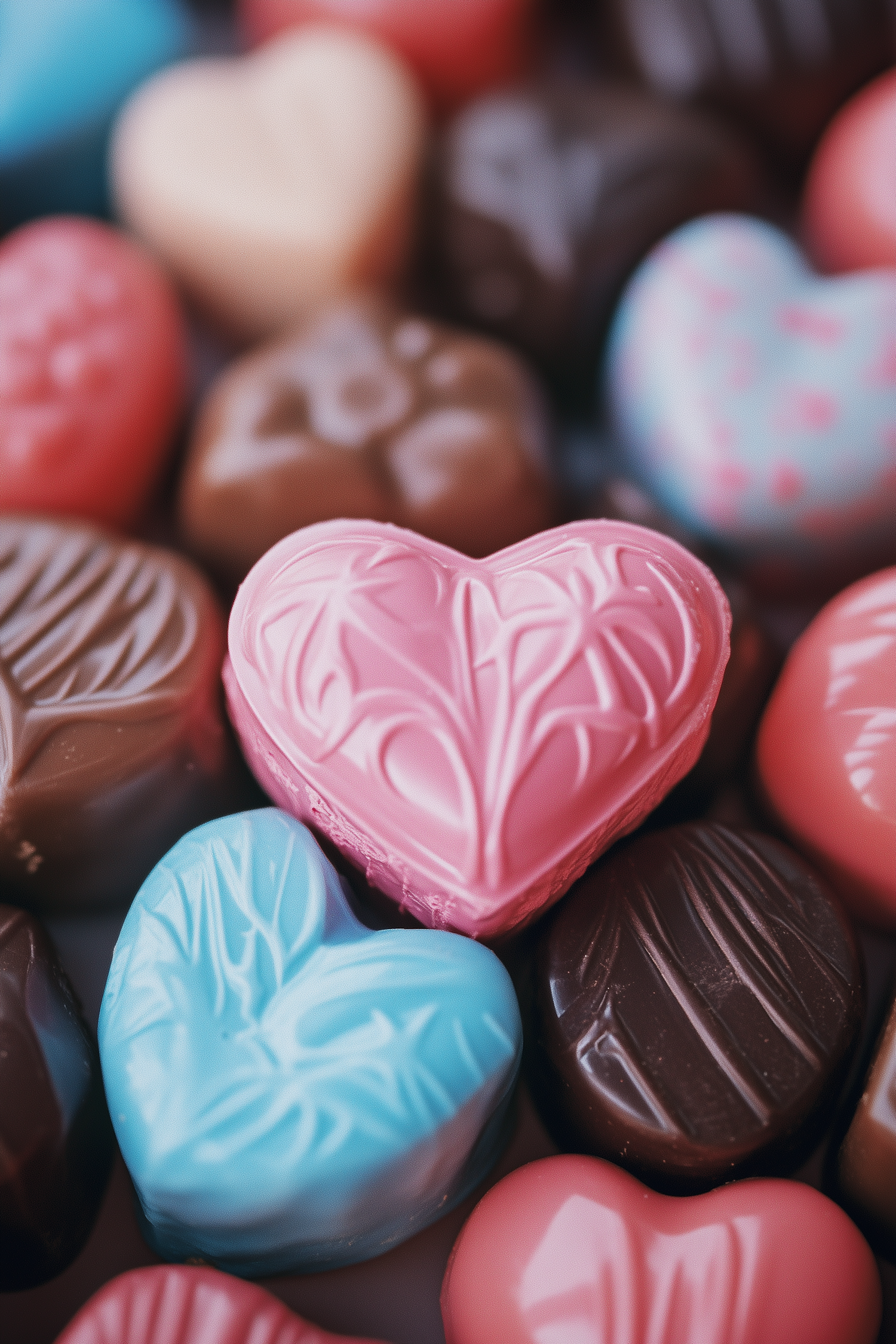 Assorted heart-shaped chocolates in pink, blue, and brown, with intricate designs and glossy finishes, creating a colorful mosaic.