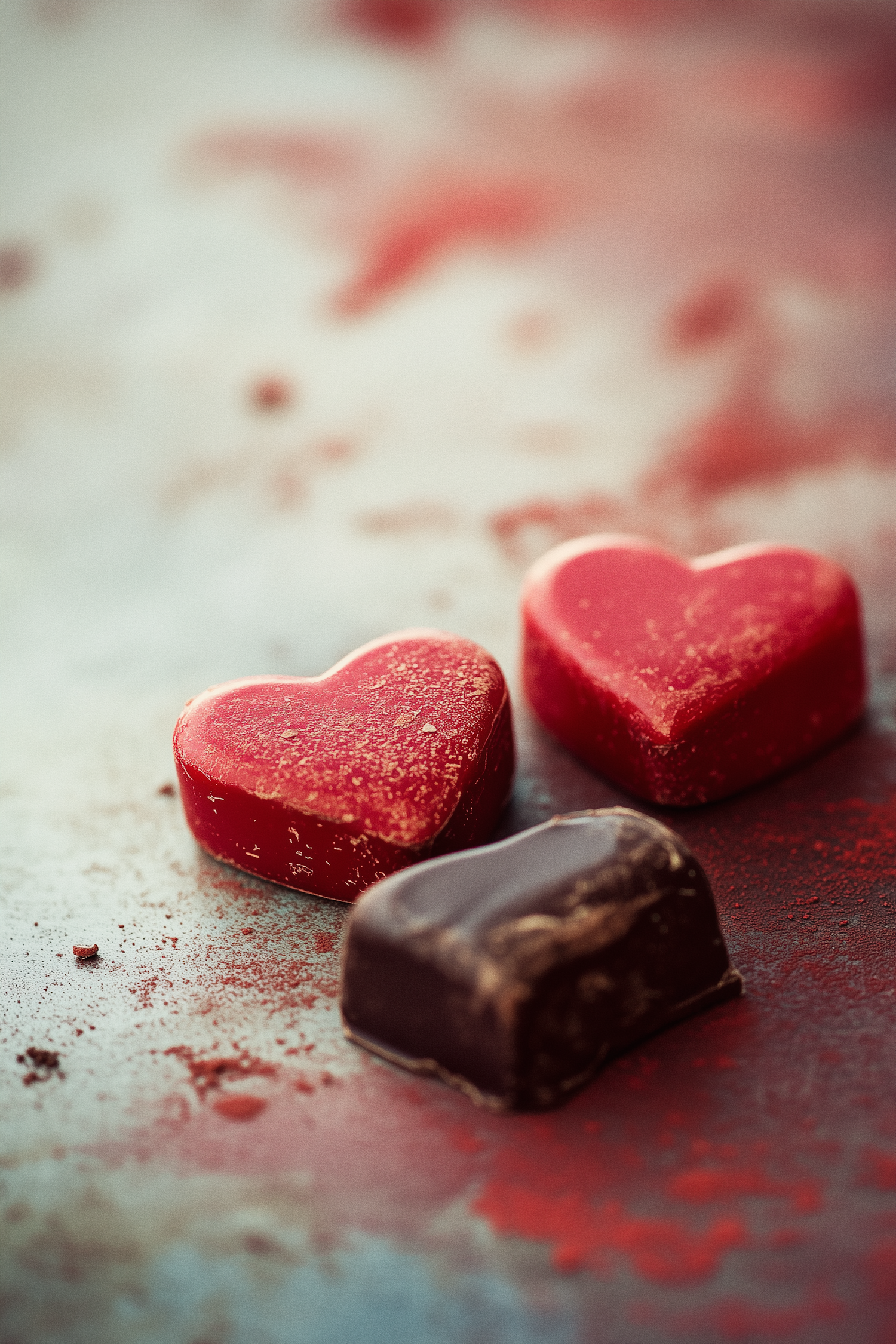 Heart-shaped chocolates in red and dark brown on a textured surface, creating a warm and inviting atmosphere.