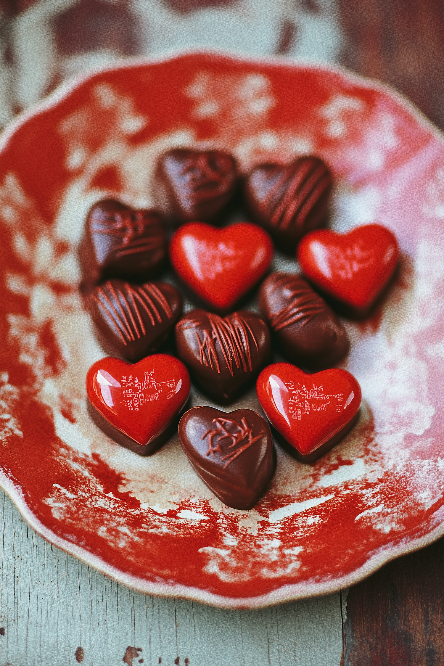 Heart-shaped chocolates in red and dark brown on a marbled red and white plate, creating a visually appealing and artistic presentation.