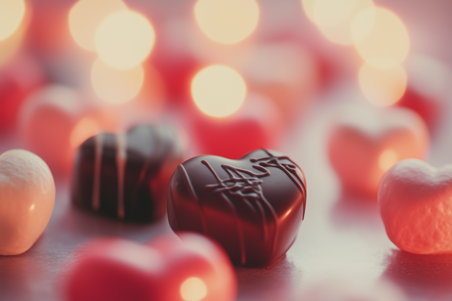Heart-shaped chocolates and candies with warm bokeh lights, creating a romantic and sweet atmosphere.