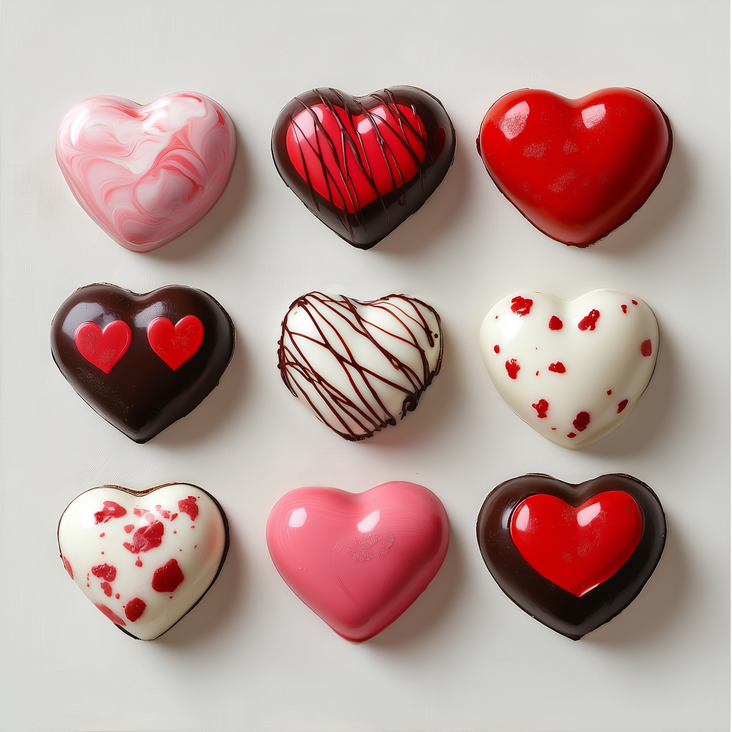 A beautiful assortment of heart-shaped chocolates with unique designs, perfect for gifting or indulging in a sweet treat.