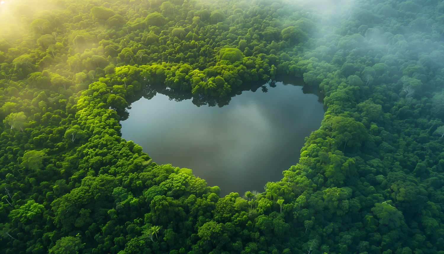 Aerial view of a heart-shaped lake surrounded by lush green forest, with mist and sunlight creating a serene, mystical atmosphere.