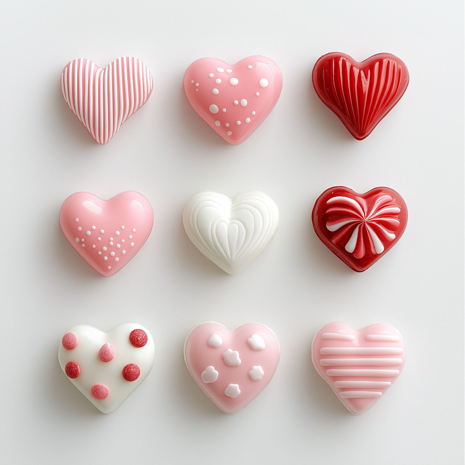 Adorable heart-shaped confections in pink, red, and white, each uniquely decorated with stripes, dots, and swirls. Perfect for Valentine's Day!