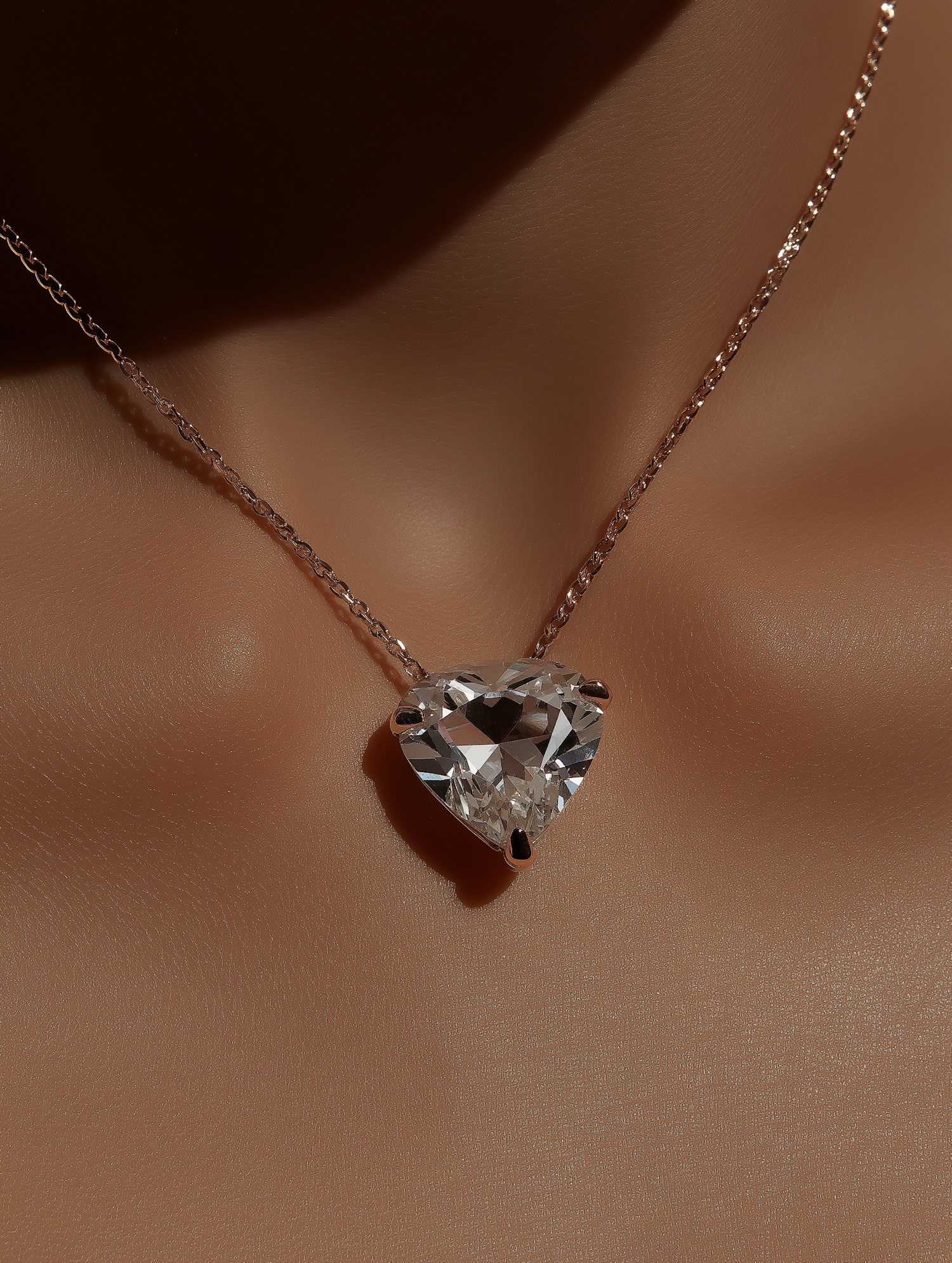 Elegant heart-shaped diamond pendant on a delicate chain against smooth skin, showcasing luxury and brilliance.