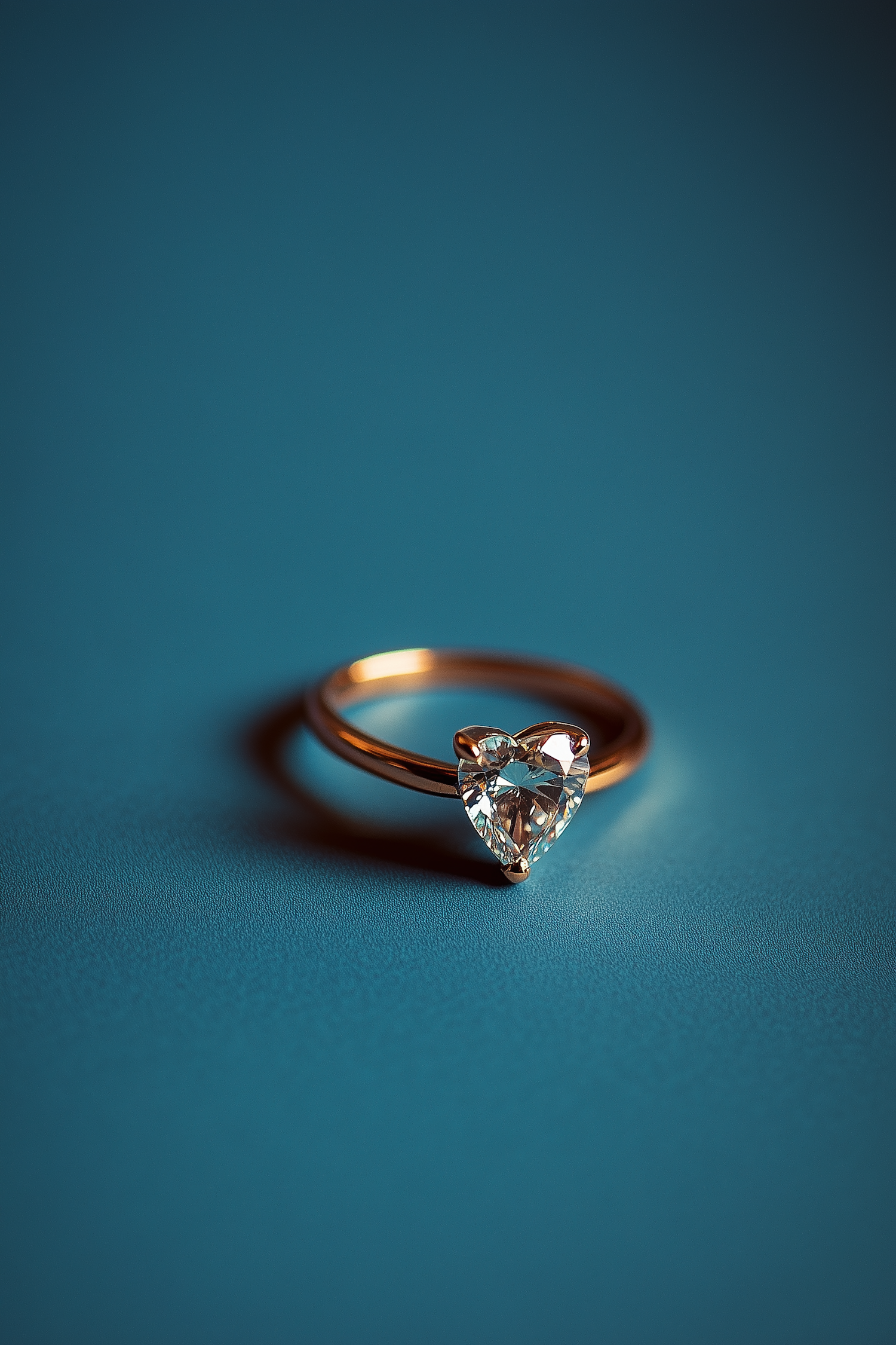 Elegant gold ring with a heart-shaped diamond on a teal background, showcasing luxury and sophistication.