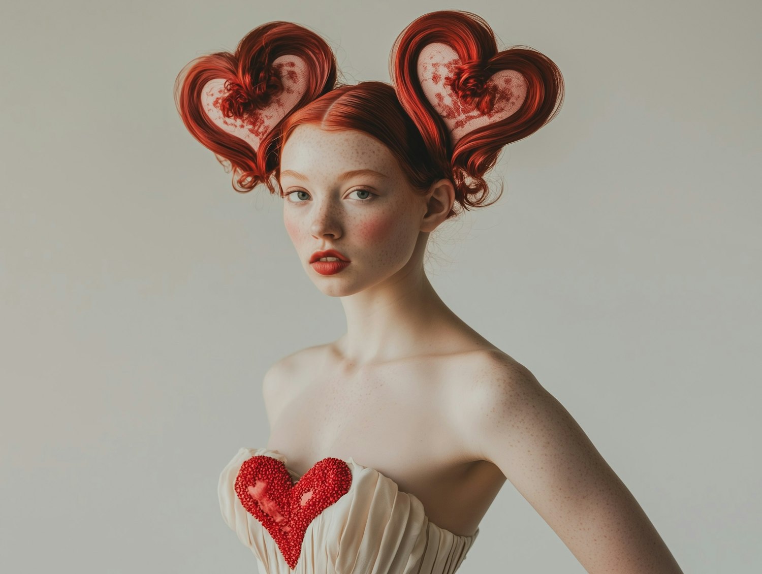 Young woman with red heart-shaped hair and a sequined heart dress, exuding a unique and artistic style.
