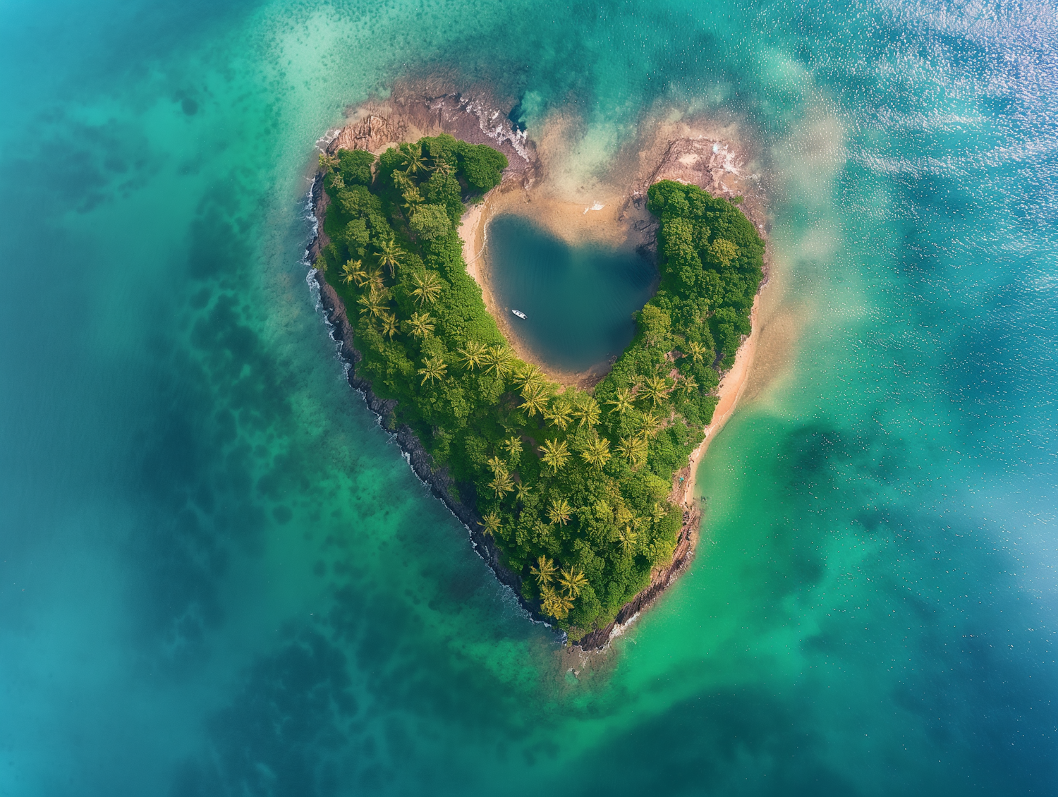 Aerial view of a heart-shaped island with lush greenery and turquoise waters, featuring a sandy beach and palm trees.