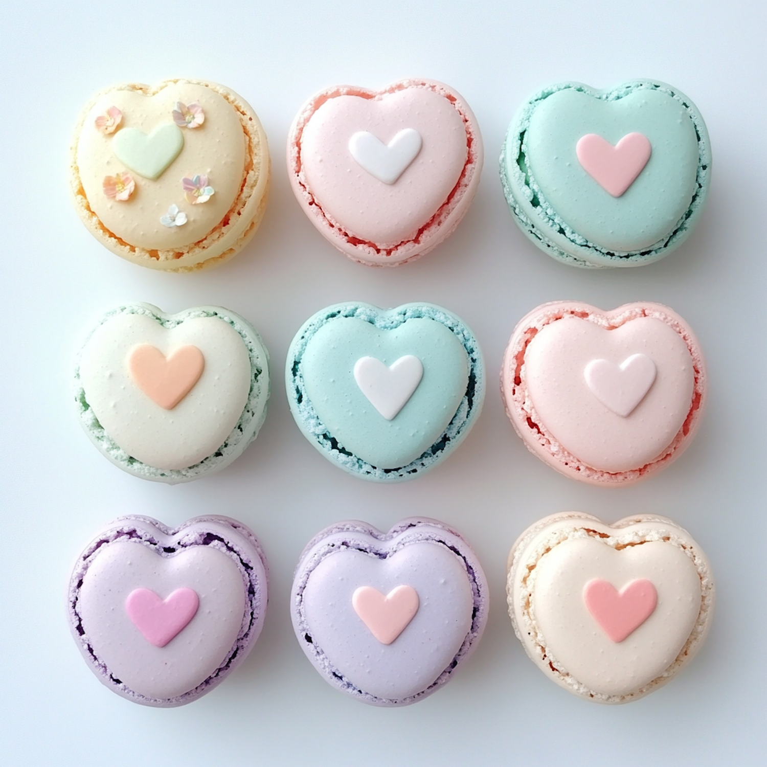 Adorable heart-shaped pastel macarons with cute heart decorations, arranged in a neat grid. Perfect for romantic or festive occasions.