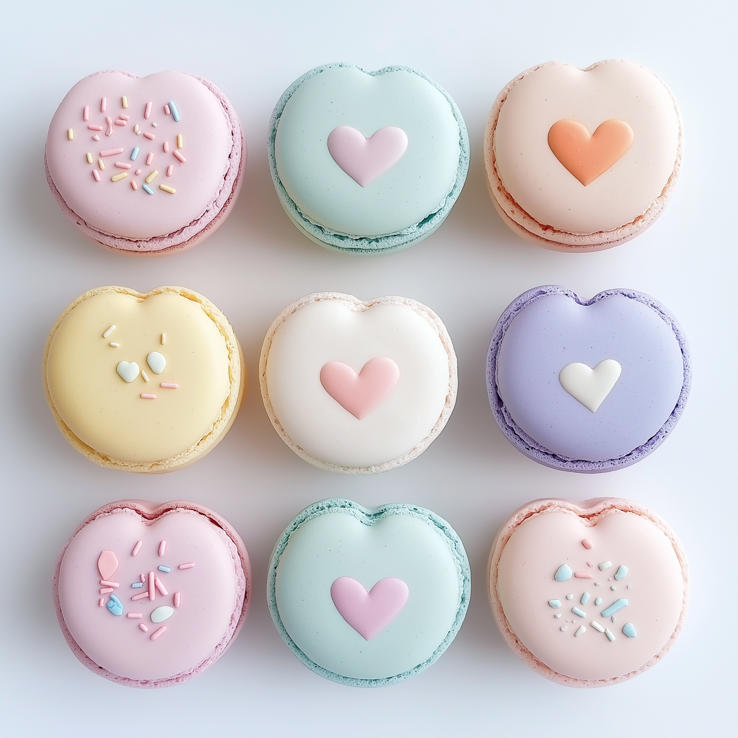 Heart-shaped pastel macarons with sprinkles and embossed hearts, arranged in a 3x3 grid on a white background. Perfect for a sweet treat!