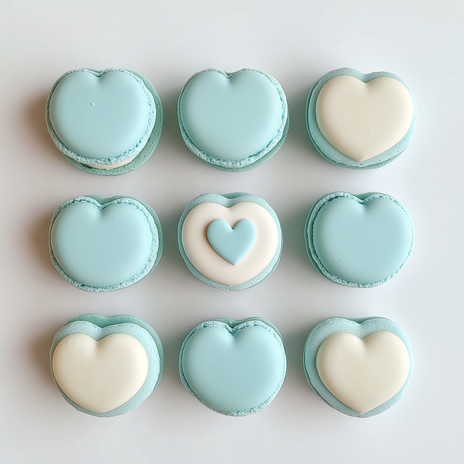 Heart-shaped pastel blue macarons with white accents arranged in a grid on a white background. Perfect for romantic or elegant themes.