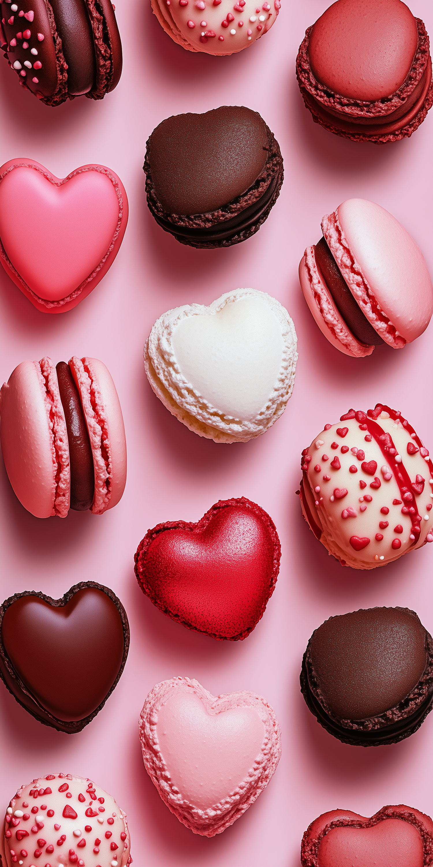 Heart-shaped macarons and chocolates in pink, red, and brown on a pink background, adorned with sprinkles for a sweet, romantic touch.