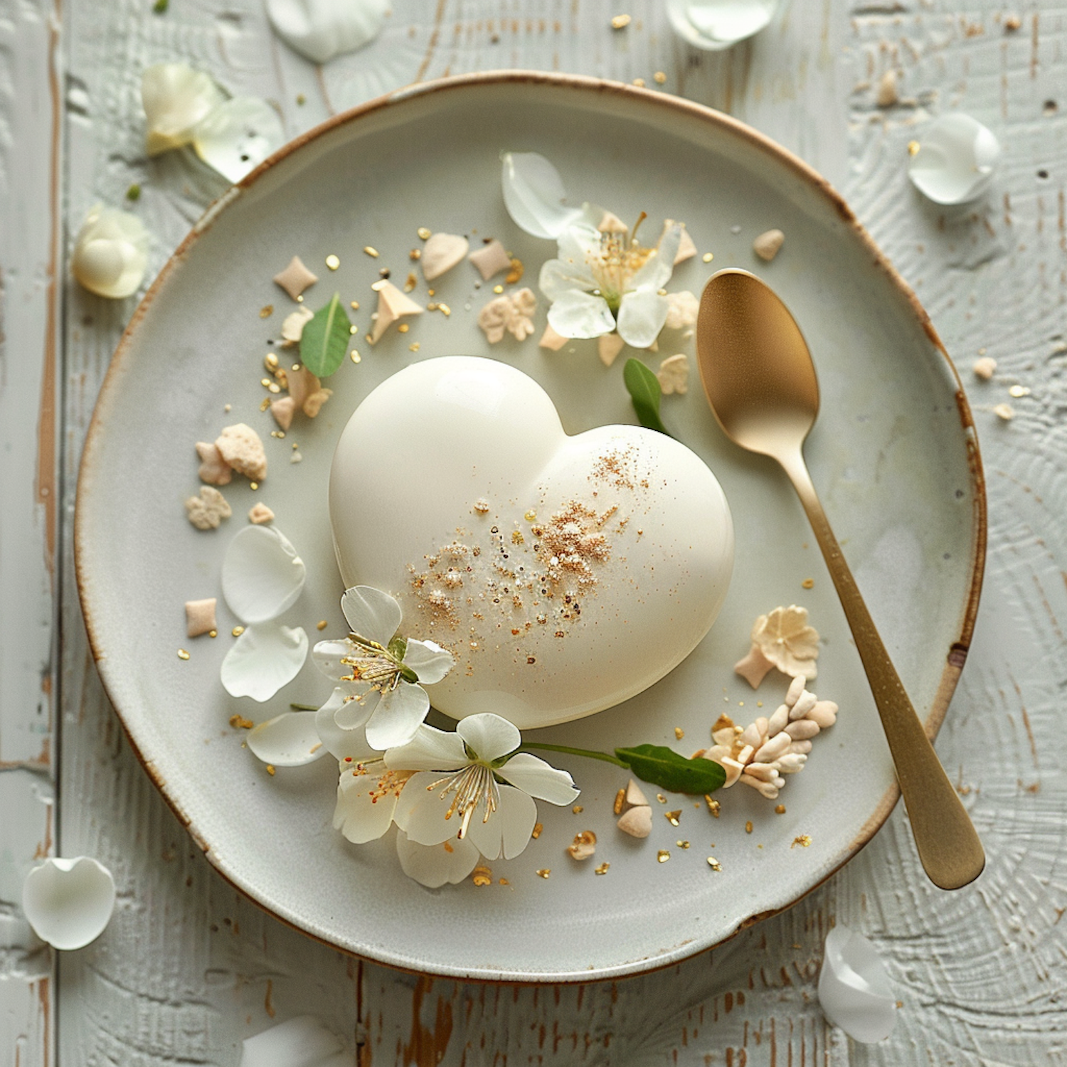Elegant heart-shaped mousse with gold flakes, white petals, and a golden spoon on a rustic plate. Perfect for a romantic dessert setting.