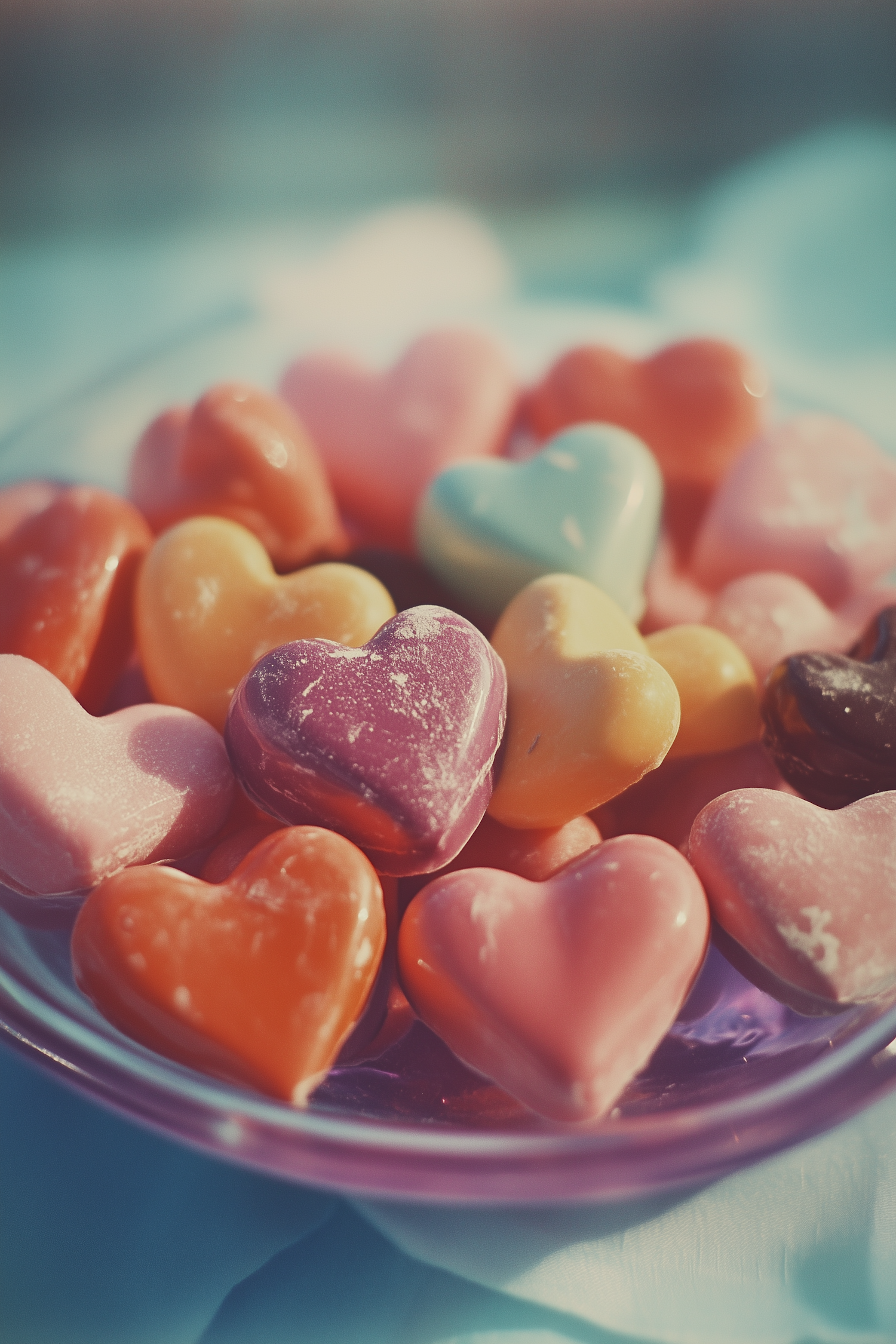 Colorful heart-shaped candies in a bowl, featuring pastel shades of pink, purple, orange, and blue, with a warm, inviting glow.