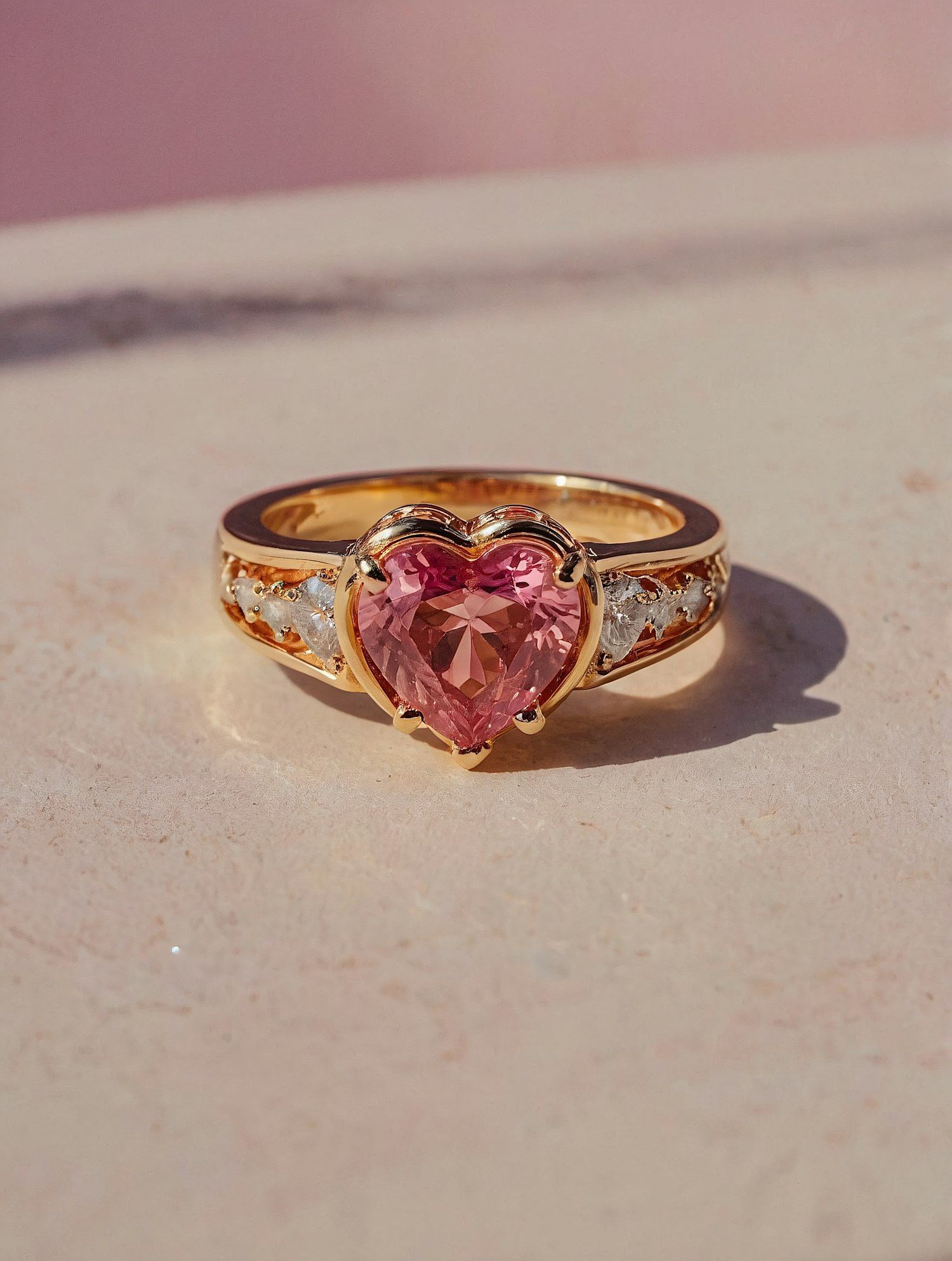 Elegant gold ring with a heart-shaped pink gemstone and intricate detailing, perfect for a luxurious statement piece.