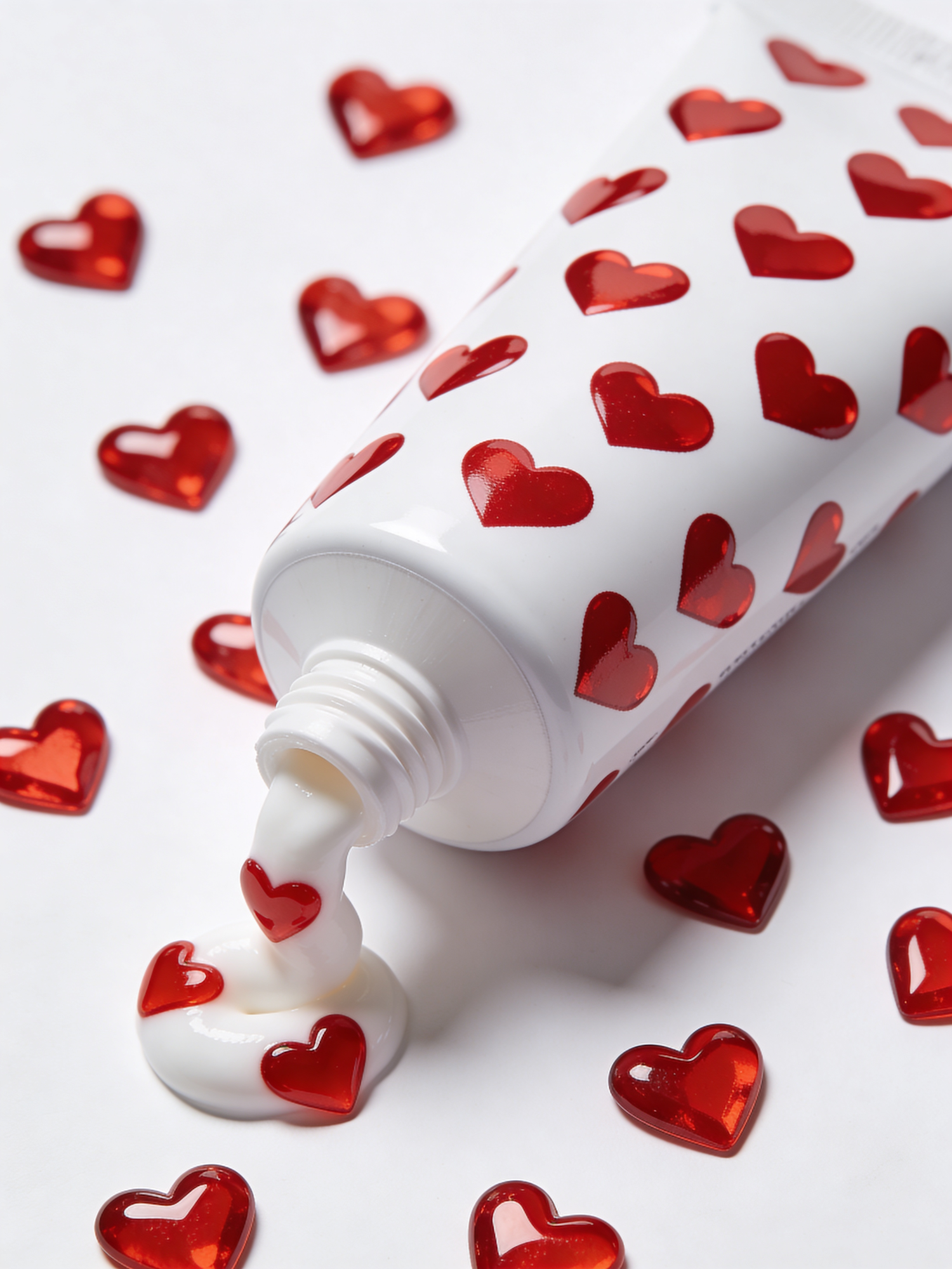 A white tube with red hearts dispenses cream onto a surface, surrounded by glossy red heart decorations on a white background.