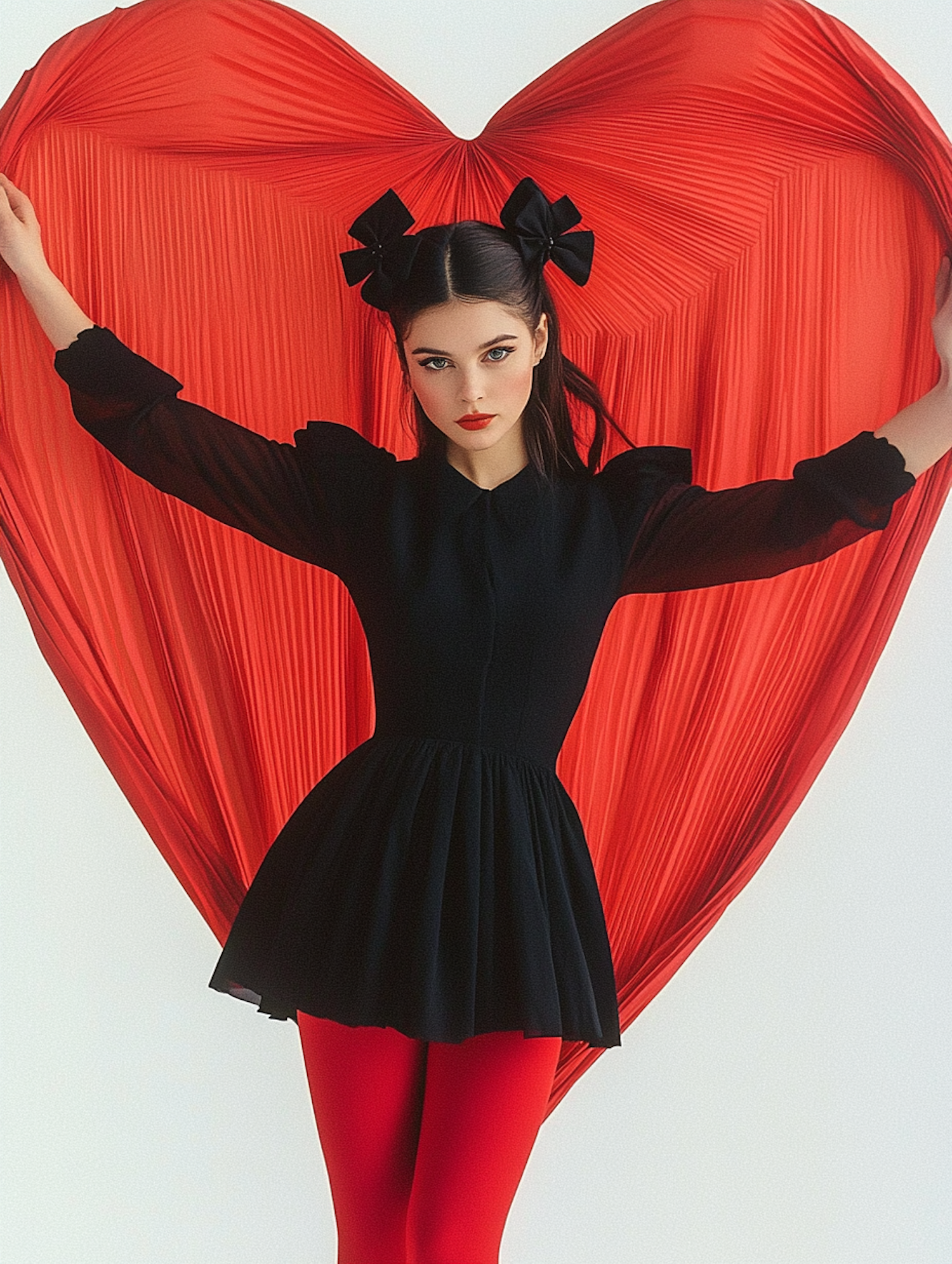Woman in black dress with red tights poses in front of a large red heart backdrop, styled with black bows and bold makeup.