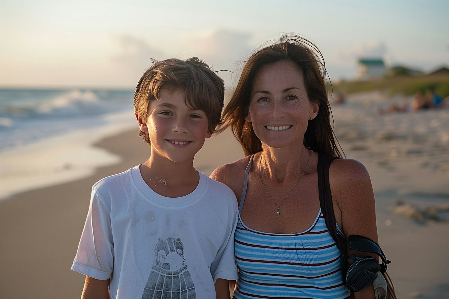 A woman and boy smiling on a beach at sunset, with gentle waves and a pastel sky in the background.