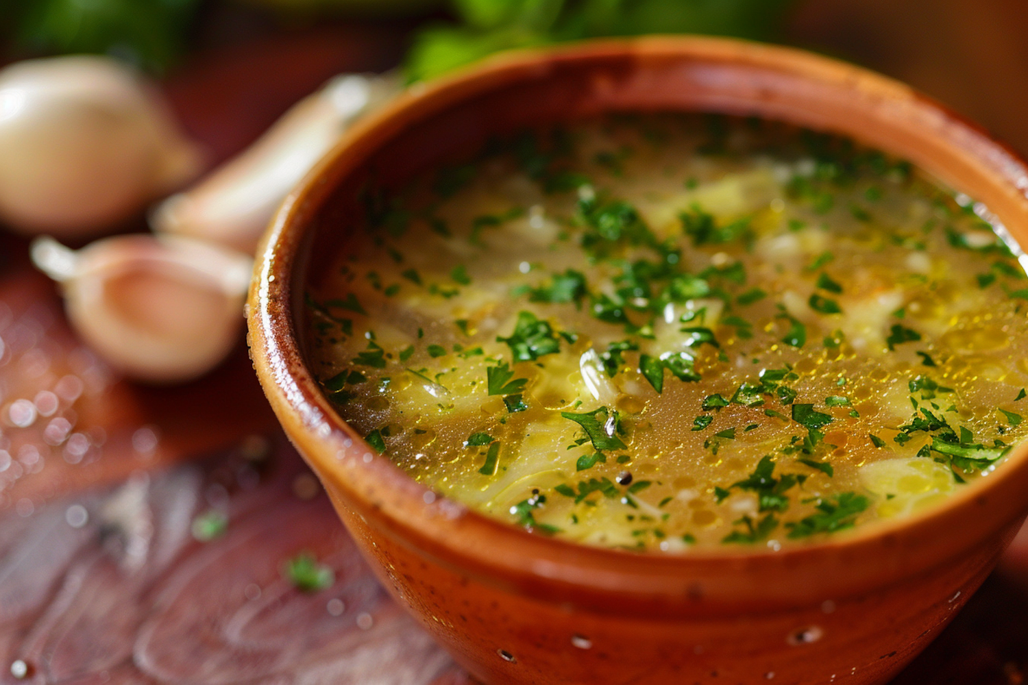 Hearty soup in an earthenware bowl with fresh herbs and vegetables, exuding warmth and comfort. Garlic cloves in the background.