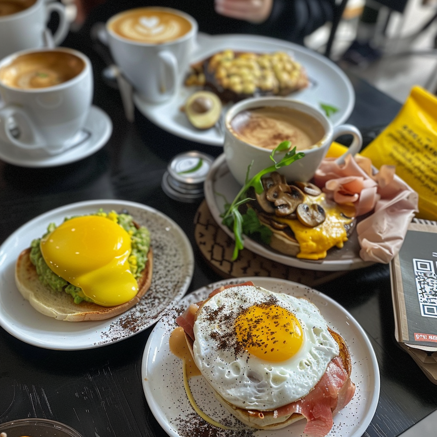 Delicious breakfast spread with avocado toast, eggs, and coffee. Perfectly poached and sunny-side-up eggs steal the show.