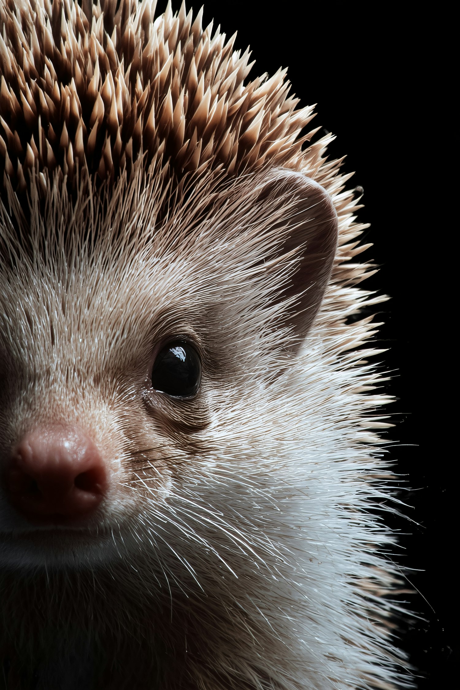 Close-up of a hedgehog's face with sharp spines and a reflective black eye, set against a black background for dramatic contrast.