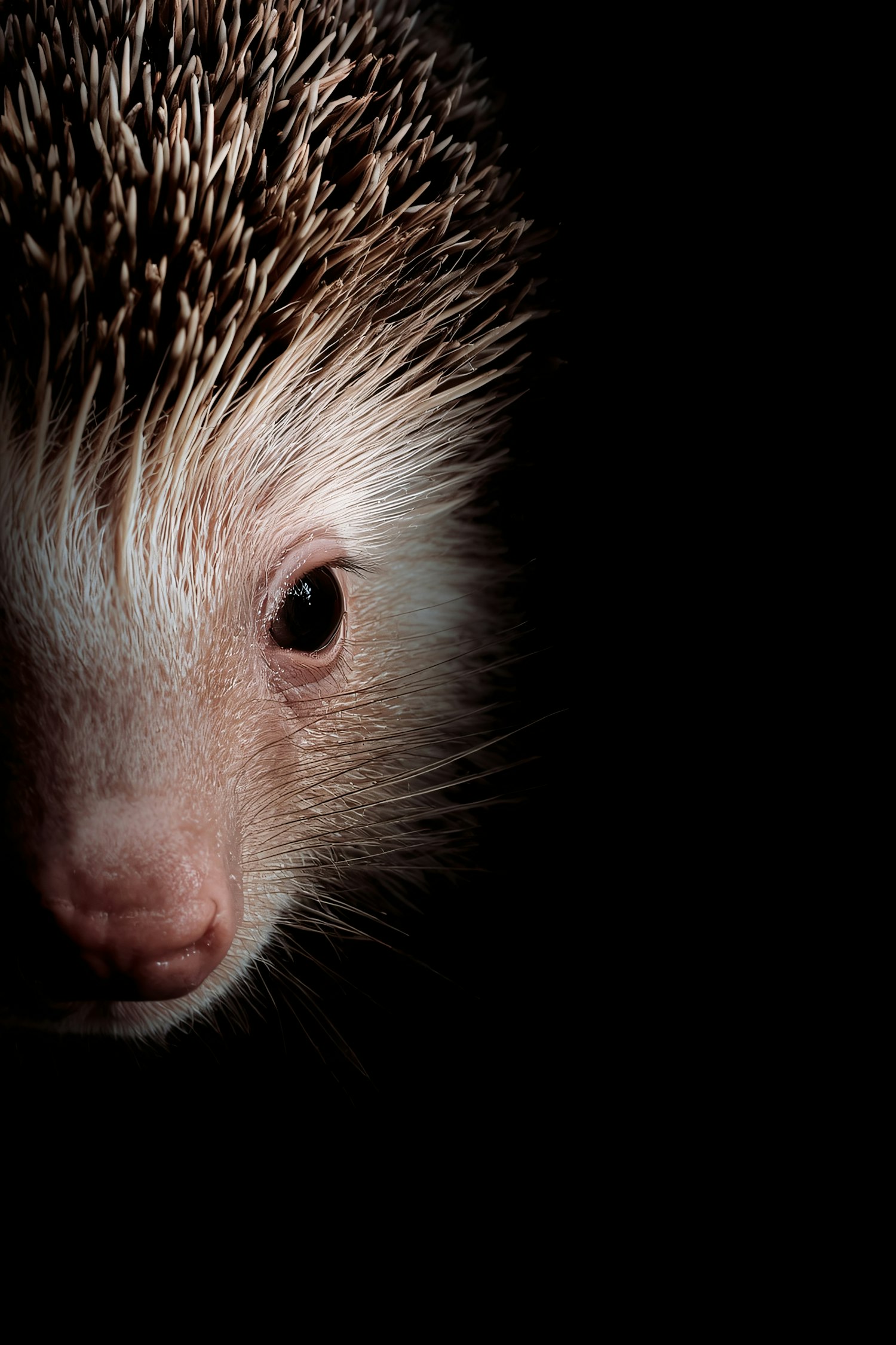 Close-up of a hedgehog's face with sharp spines and a pink nose, set against a black background for a striking contrast.