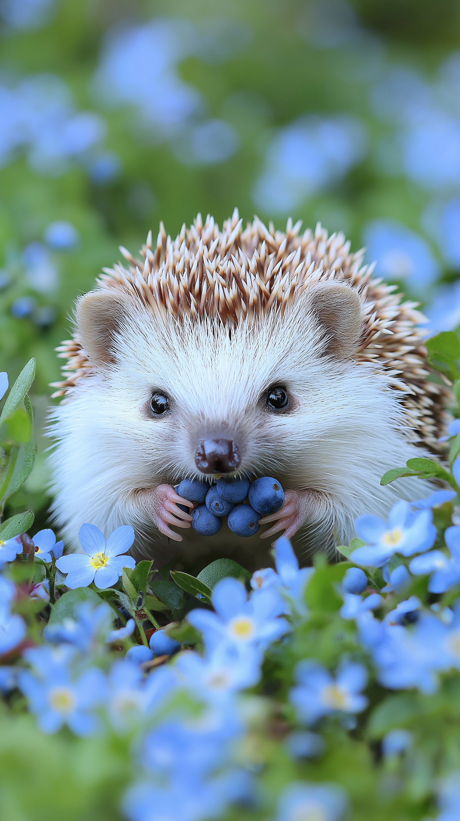 Adorable hedgehog holding blueberries among vibrant blue flowers, creating a charming and colorful nature scene.