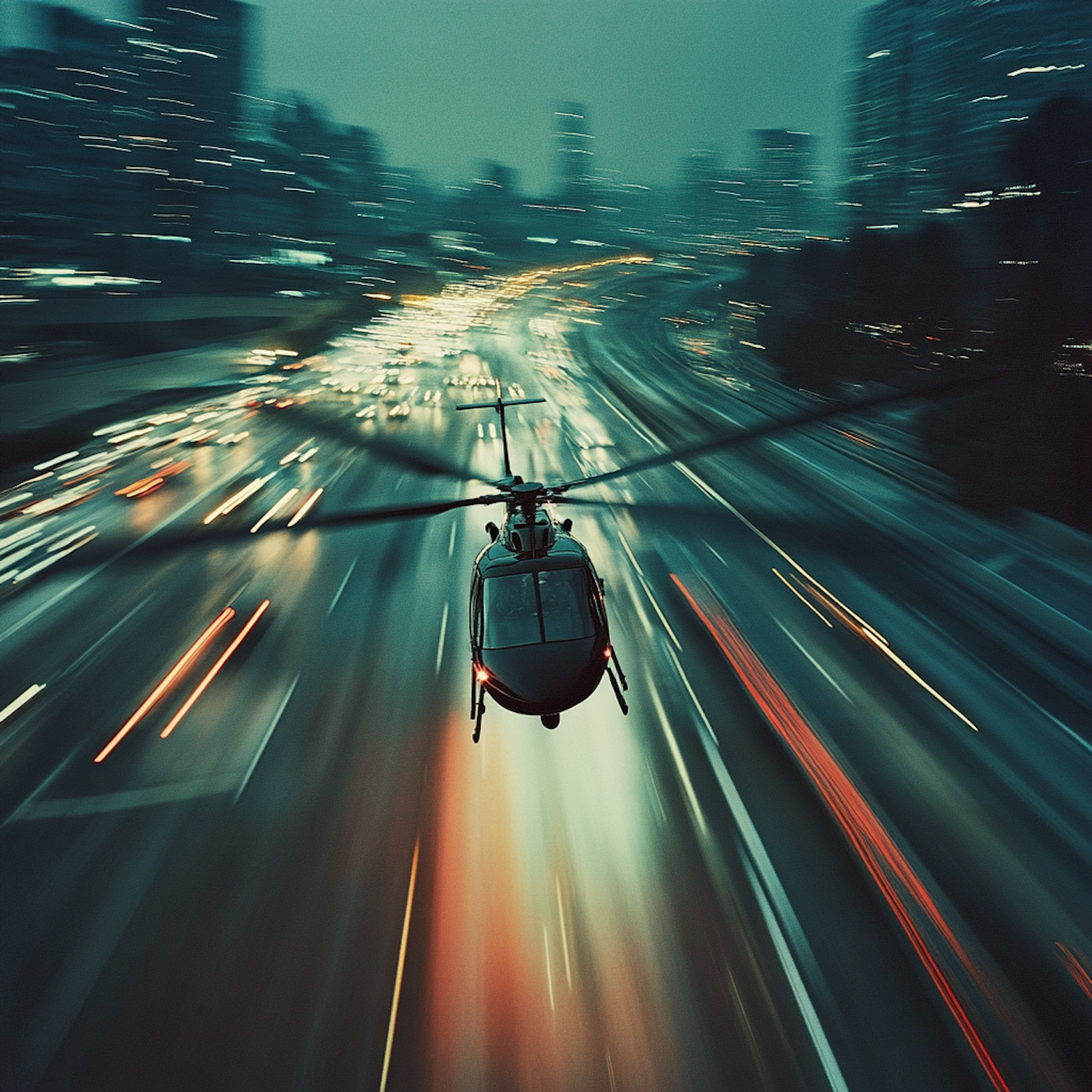Helicopter flying over a busy highway at night, with city lights and traffic creating dynamic light streaks.
