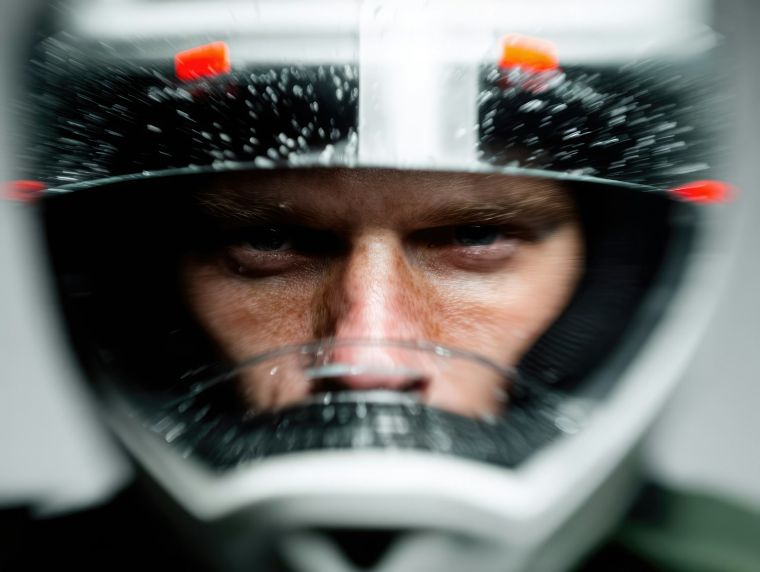 Close-up of a person in a helmet with water droplets on the visor, showcasing their intense gaze and the helmet's detailed design.