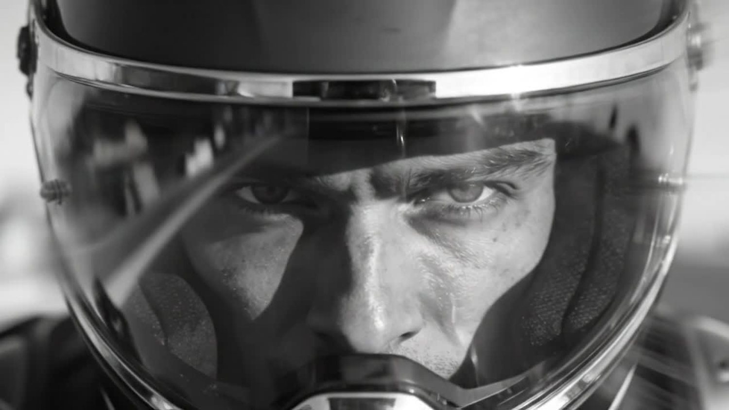 Close-up black-and-white photo of a person wearing a motorcycle helmet, focusing on their intense eyes through the visor.