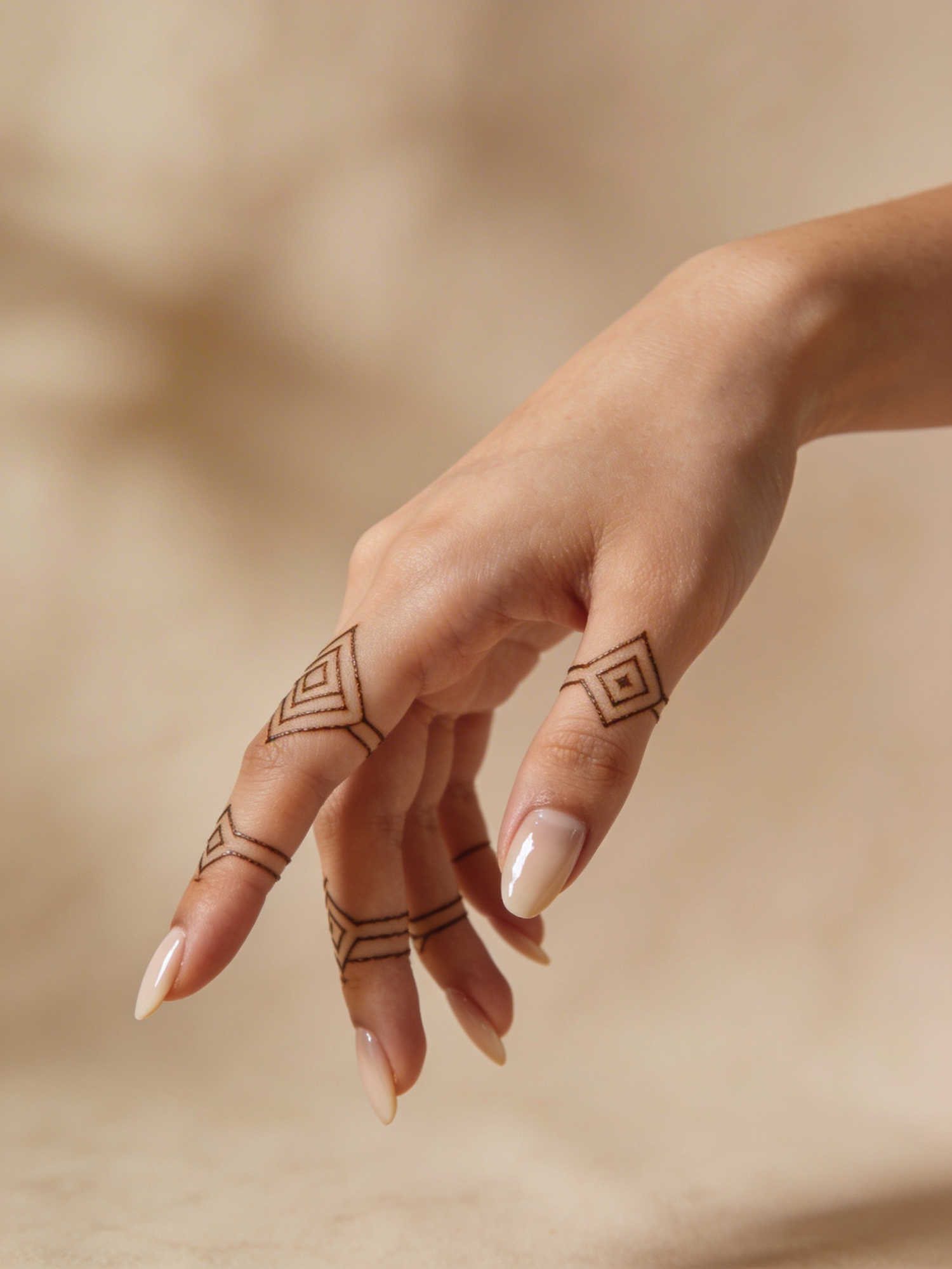 A close-up of a hand with geometric henna designs and nude manicured nails, set against a soft beige background.