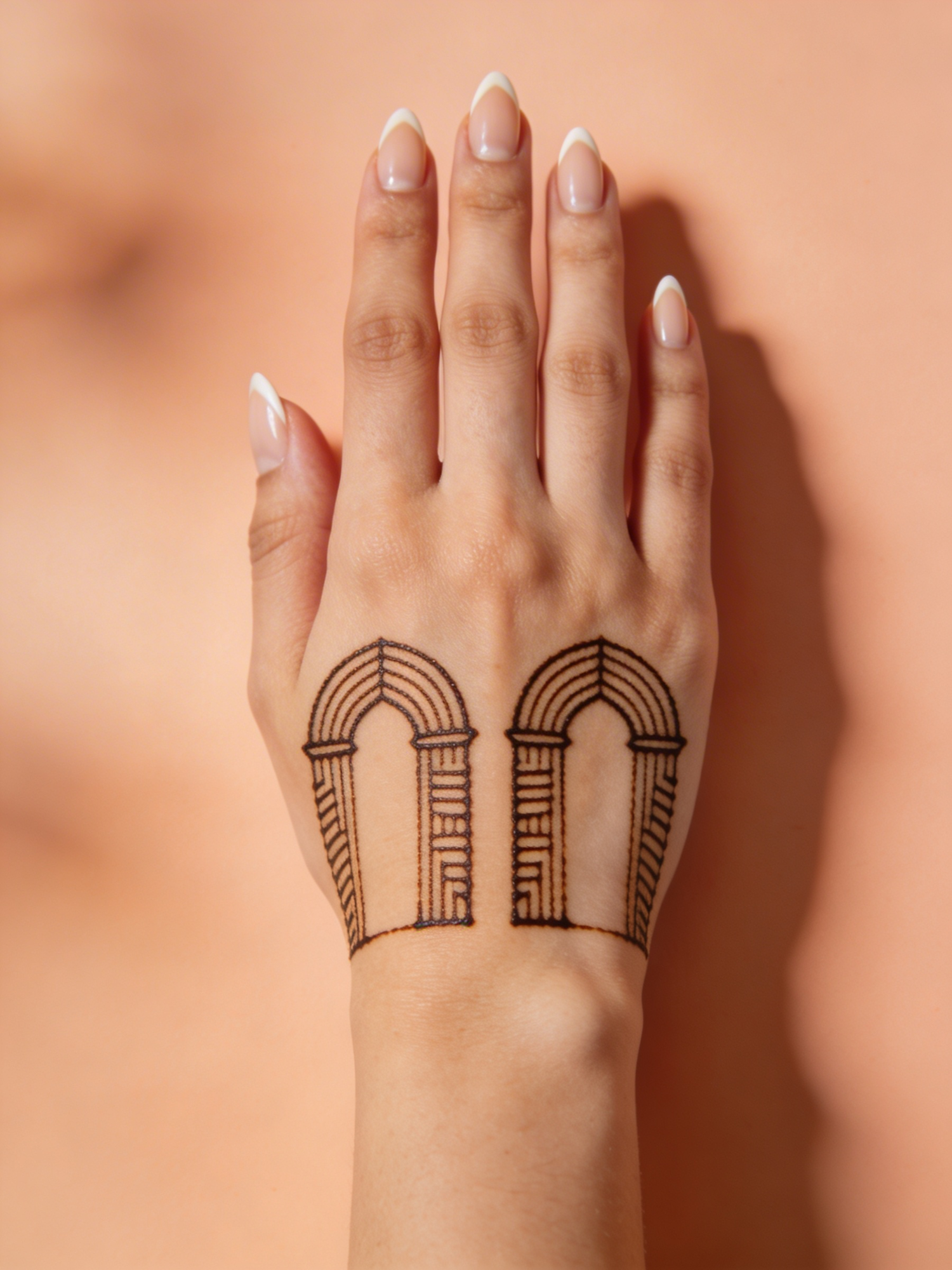 A modern hand shot featuring dual architectural henna arcs mirrored across the back of the hand, clean almond nails, soft shadows, warm peach backdrop, no text.