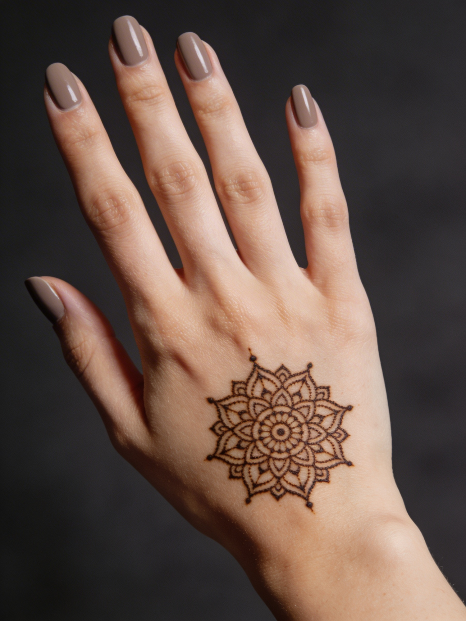 A minimal mandala fragment henna design centered on the hand, clean matte taupe nails, high‑detail skin texture, Scandinavian editorial lighting, charcoal backdrop, no text.