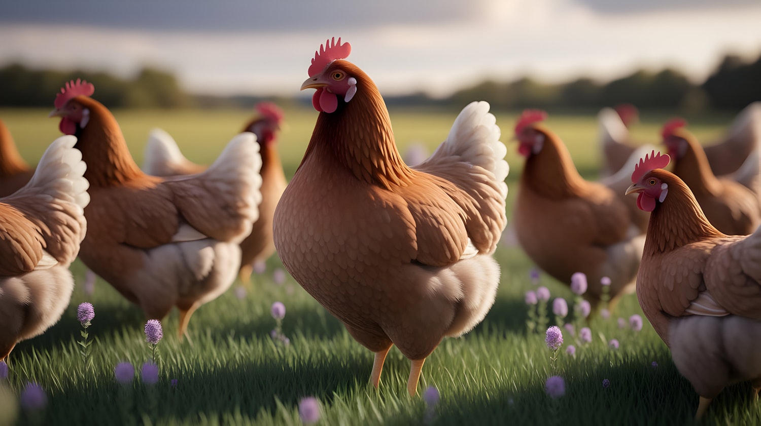 Brown hens roam a sunlit green field dotted with purple flowers, creating a serene countryside vibe.