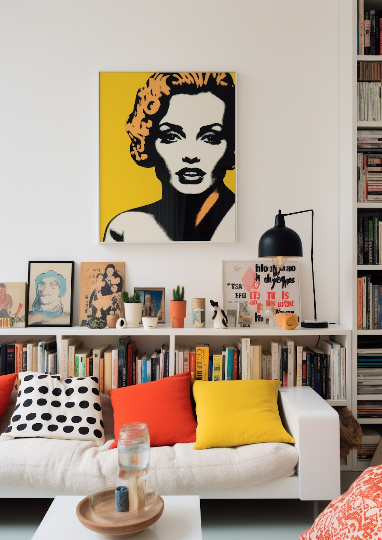 Stylish living room with pop art, colorful cushions, and a bookshelf. Modern decor with vibrant accents and artistic flair.