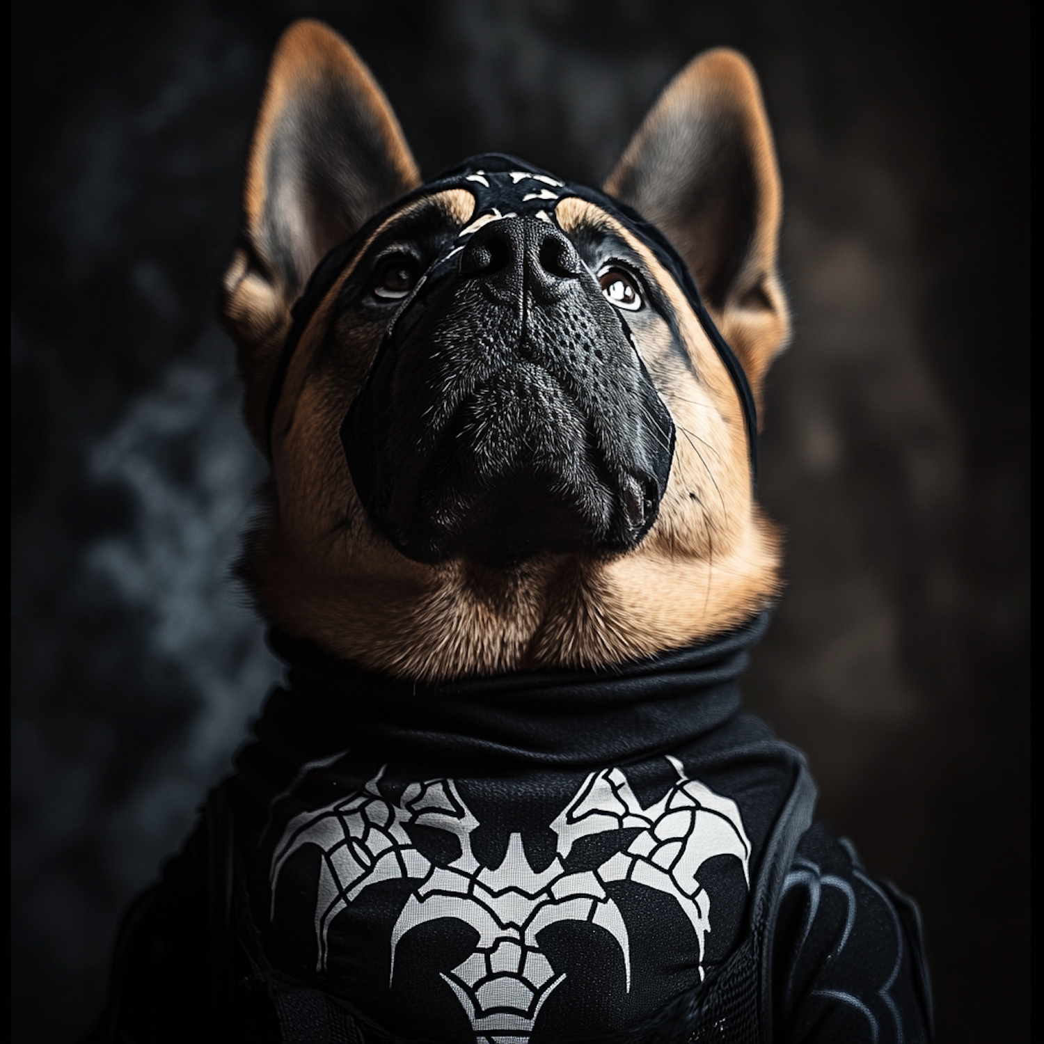 A German Shepherd in a superhero costume with a bat emblem looks upward dramatically, set against a dark, moody background.