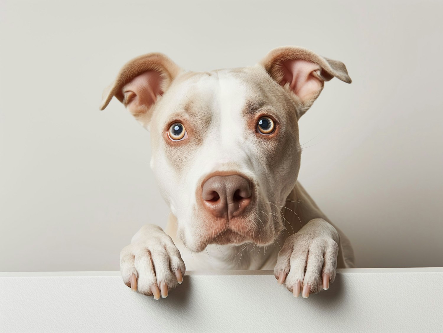 Adorable light-colored dog with blue eyes peering over a white surface, showcasing a curious and gentle expression.