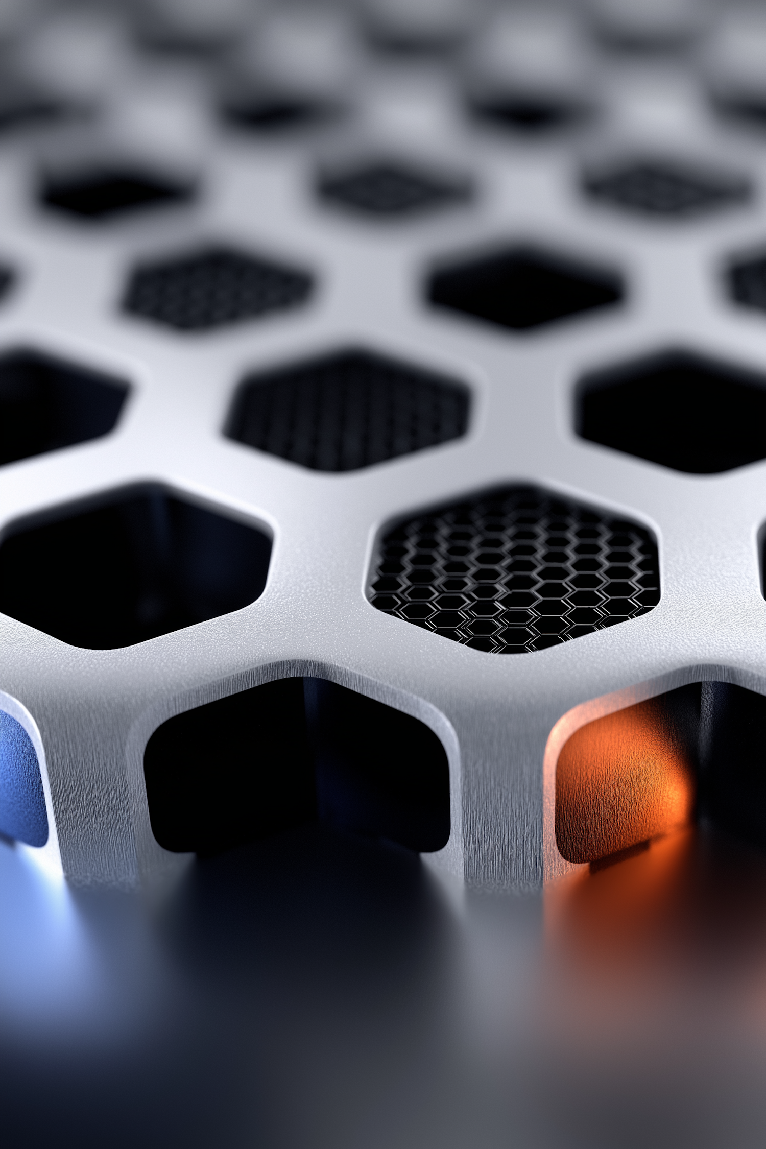 Close-up of a metallic hexagonal pattern with glowing orange and cool tones, showcasing intricate textures and depth.