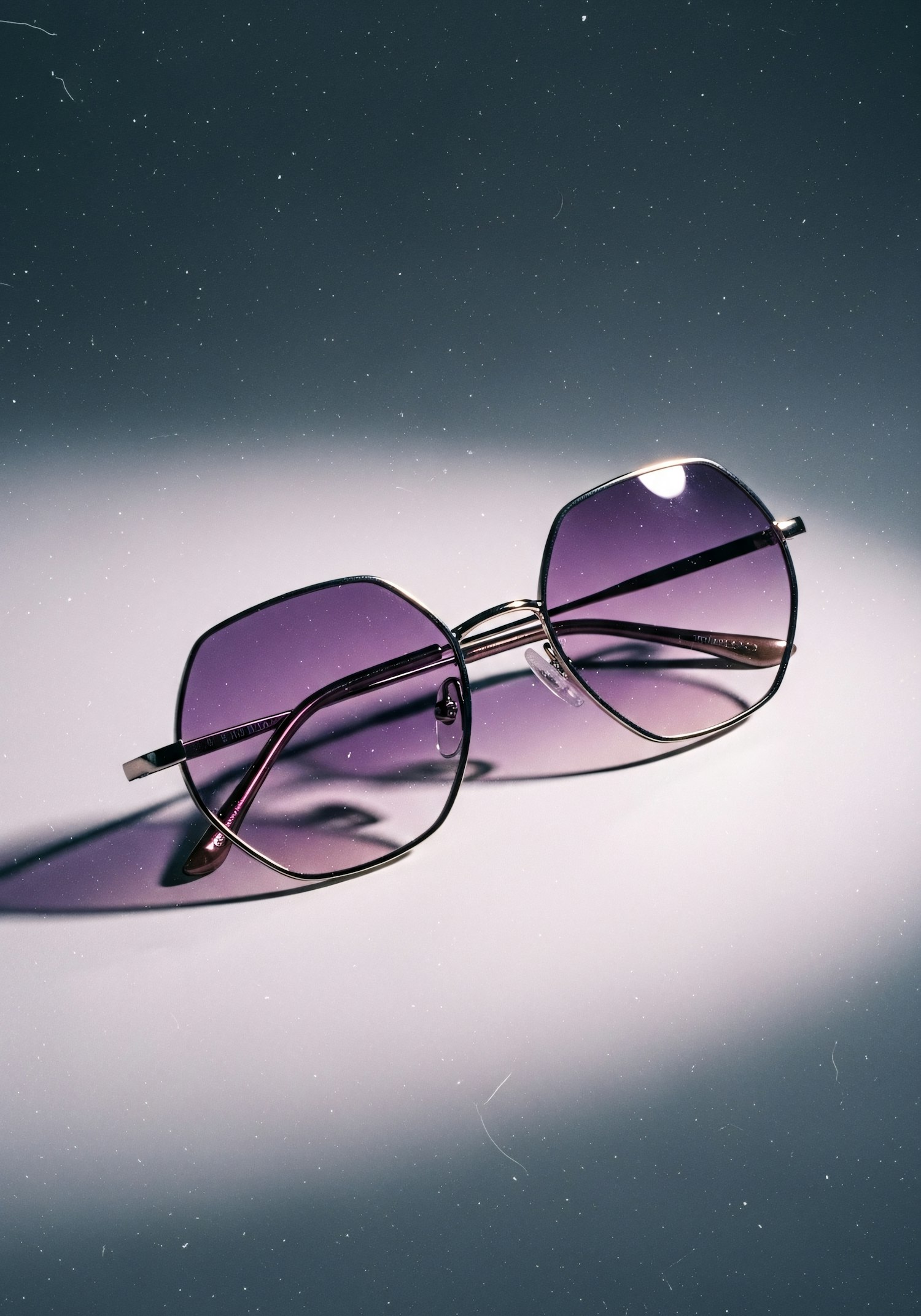 Stylish hexagonal sunglasses with purple lenses on a gradient background, showcasing elegance and modern design.