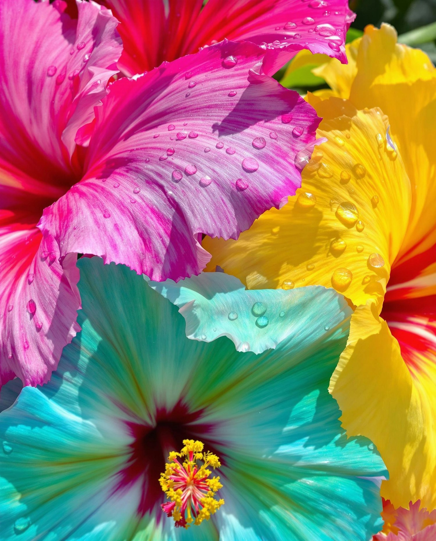Close-up of colorful hibiscus flowers with water droplets, featuring vibrant pink, turquoise, and yellow petals in stunning detail.
