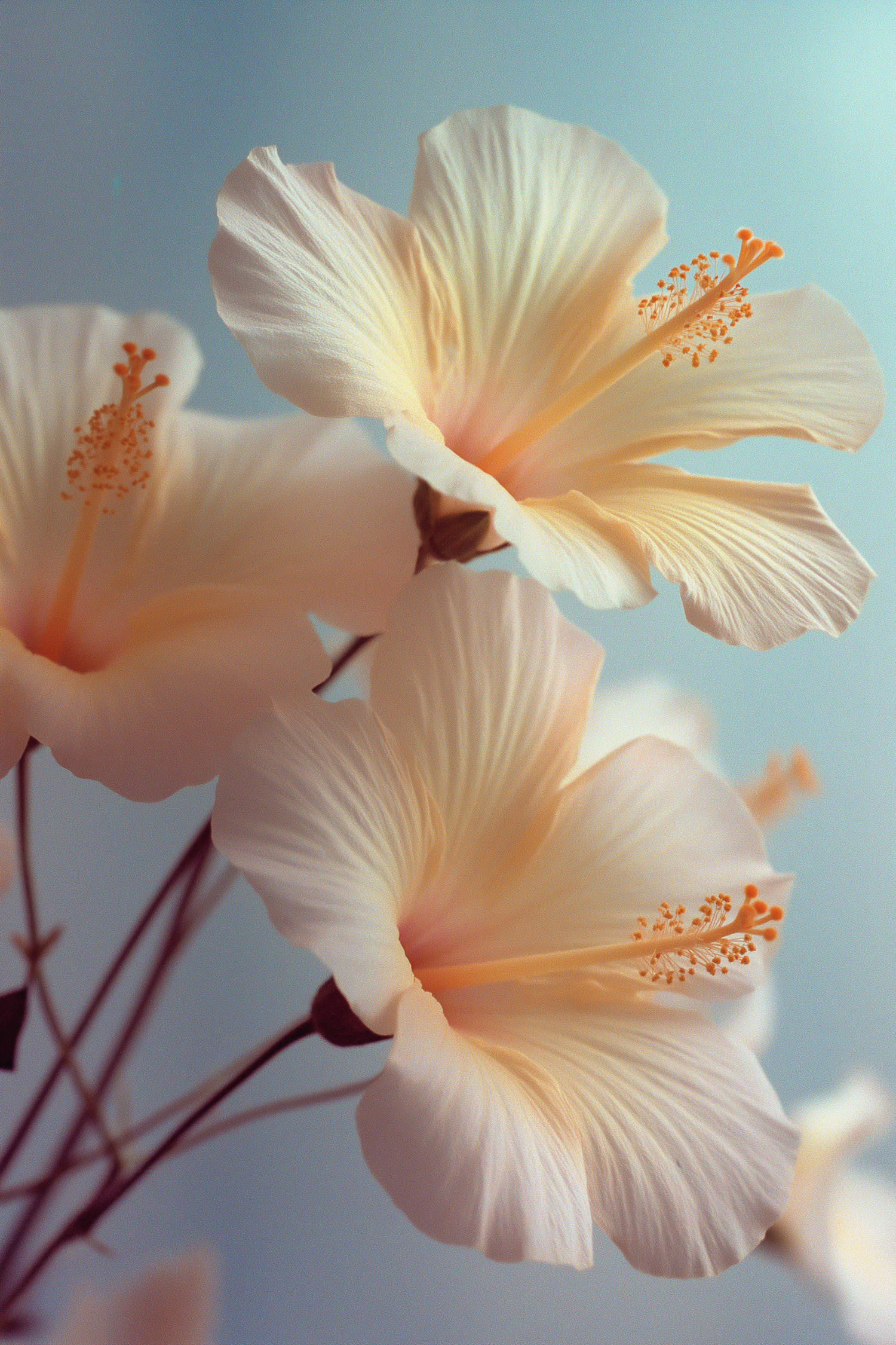 Soft white hibiscus flowers with peach accents against a subtle blue background, highlighting their delicate details and vibrant orange stamen.