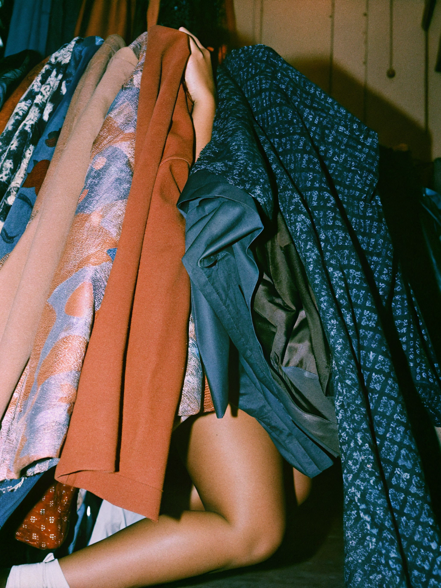 A person kneels under a rack of colorful clothes, showcasing vibrant patterns and textures in a dimly lit space.