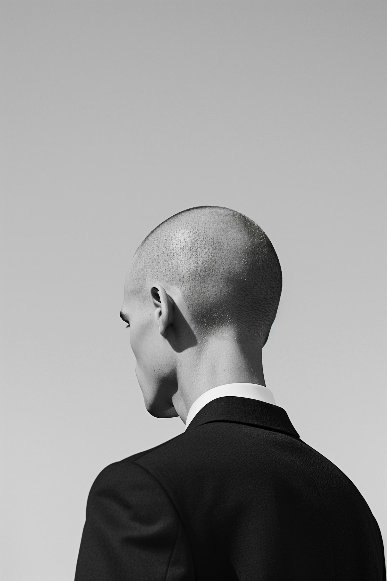 Black and white photo of a person with a shaved head in a suit, viewed from behind against a plain background.