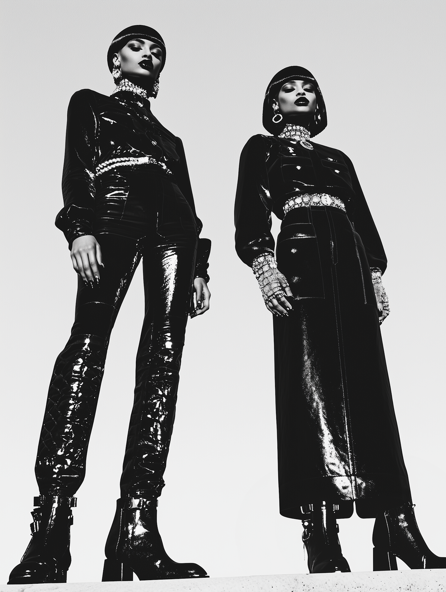 Two women in glossy black high-fashion outfits pose confidently in a bold, monochromatic black-and-white image.