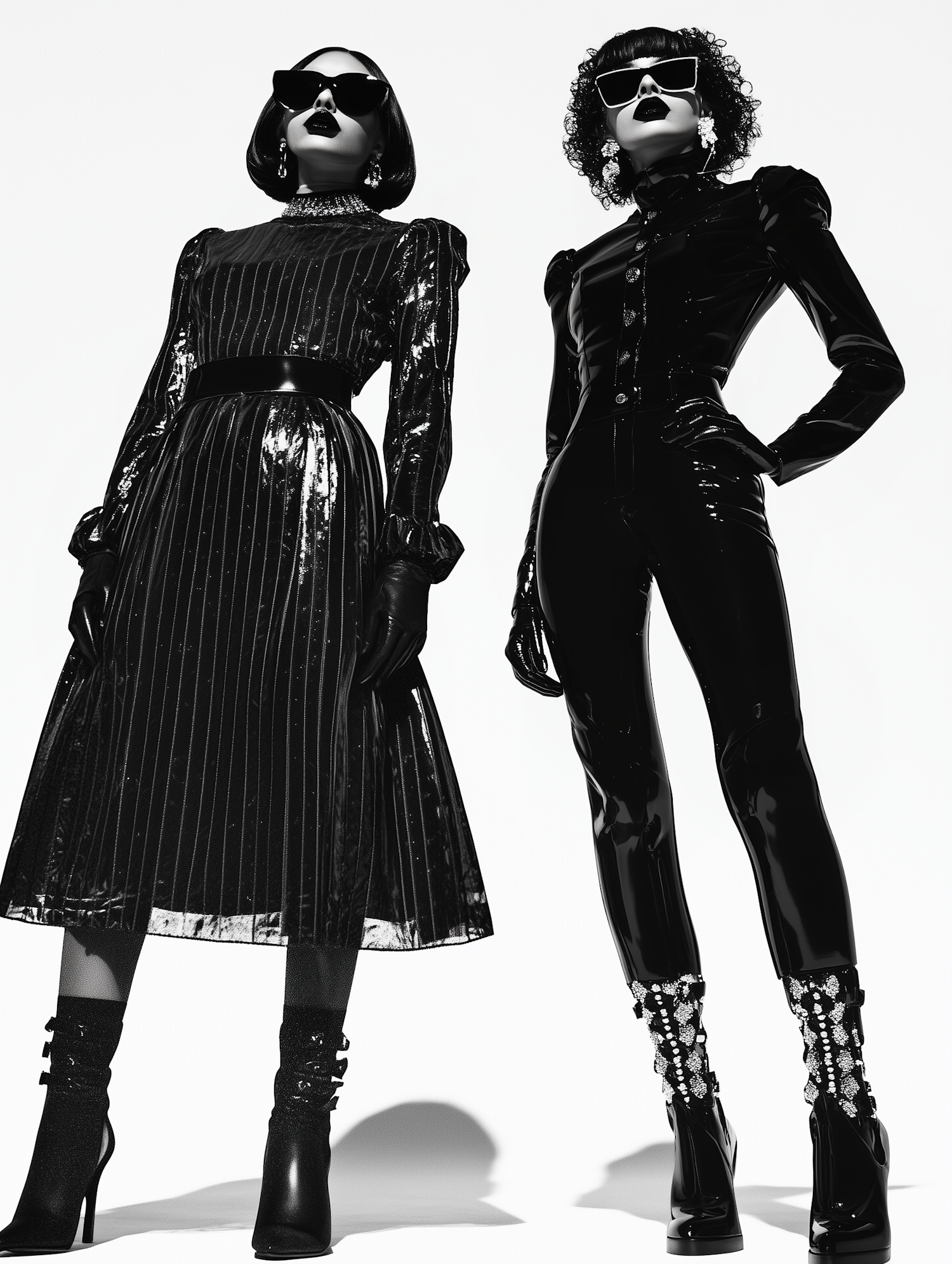 Two women in glossy black high-fashion outfits, styled with sunglasses, gloves, and bold boots, exuding a futuristic and edgy vibe.