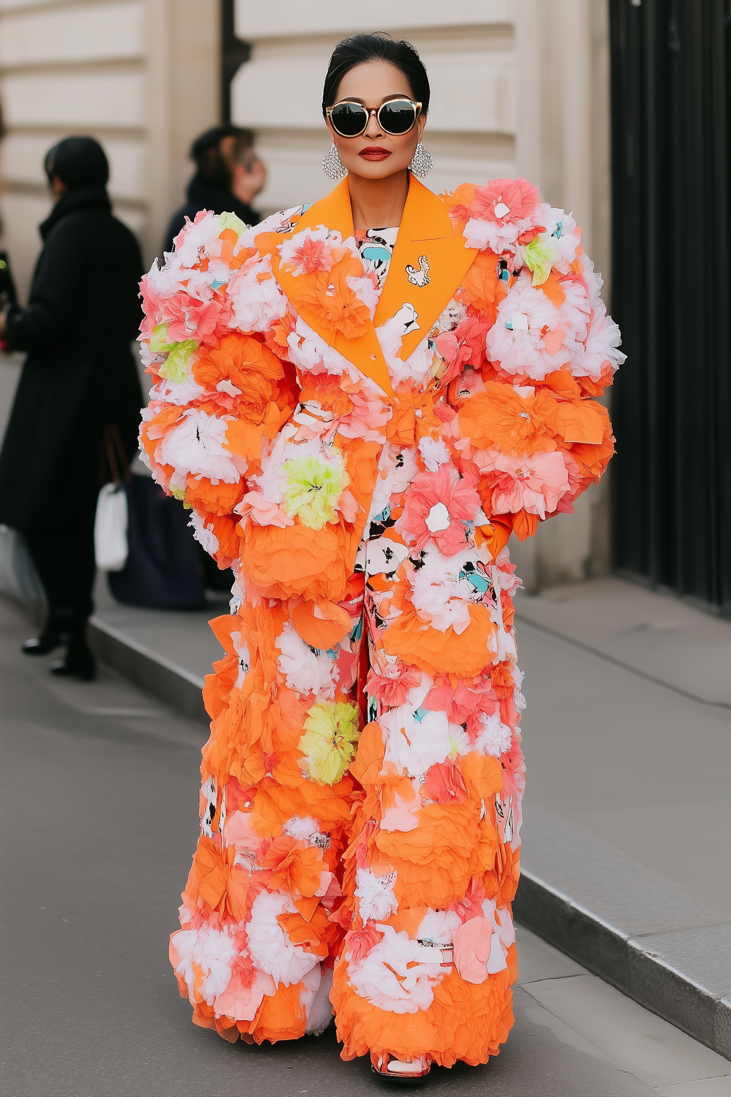 Woman in vibrant floral outfit with oversized sunglasses and bold makeup in an urban setting.