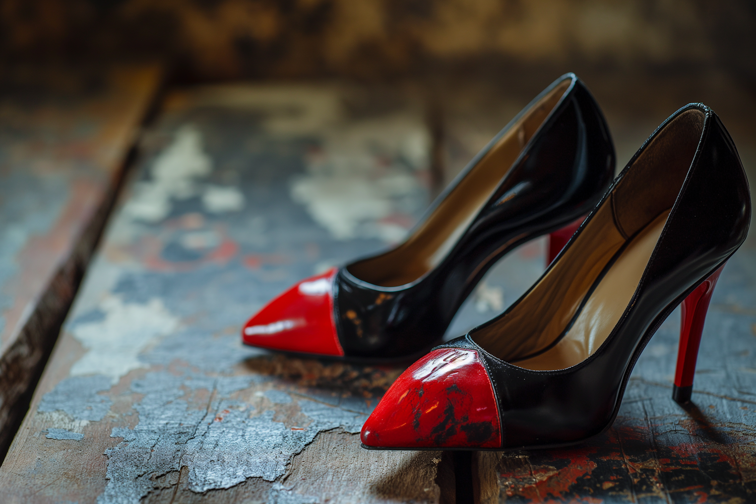 Elegant black and red high heels on a rustic wooden surface, showcasing a glossy finish and bold design.